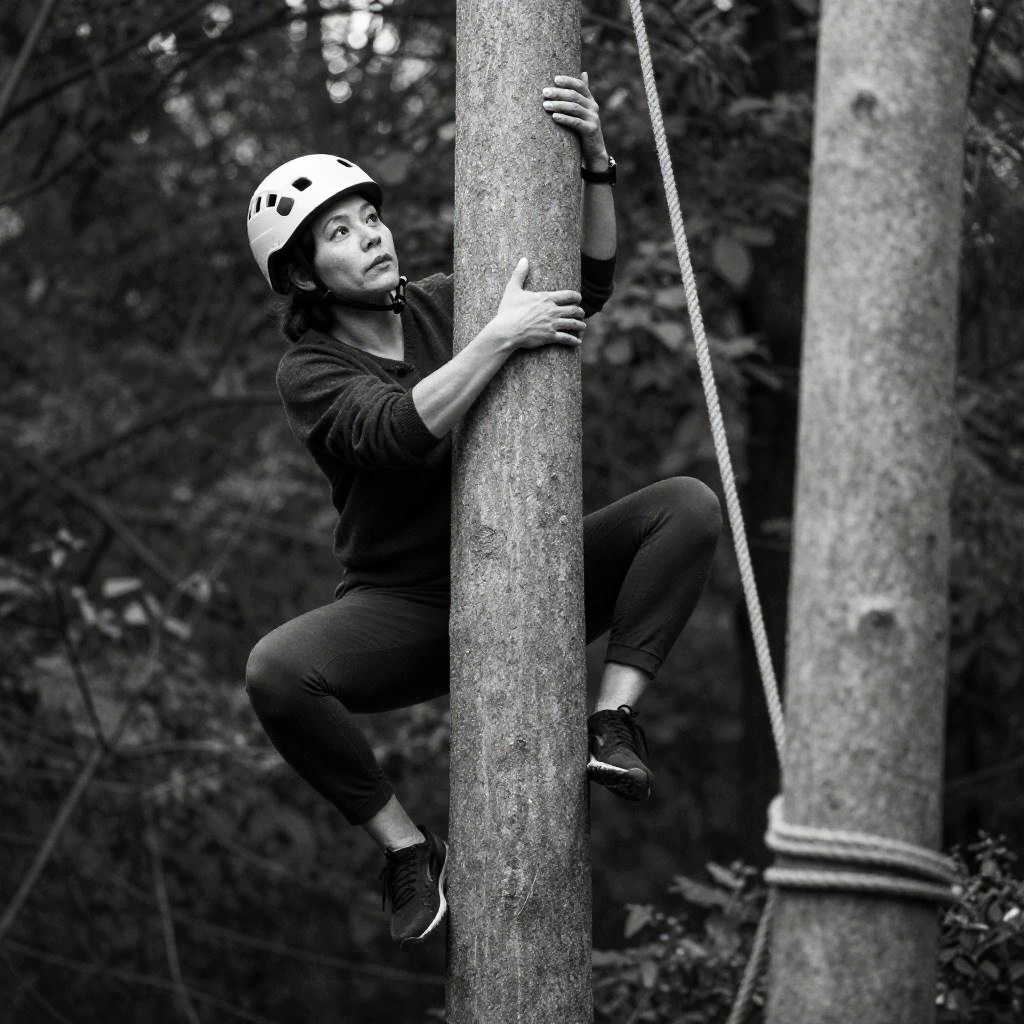 Black and white photograph of a woman with light skin, wearing a white helmet and dark sweater, climbing a tall tree trunk. She has short dark hair, crossed legs, and black shoes. Her hands grip the tree trunk, and her expression is focused. Another tree trunk with rope is in the foreground on the right. Dense foliage fills the background.