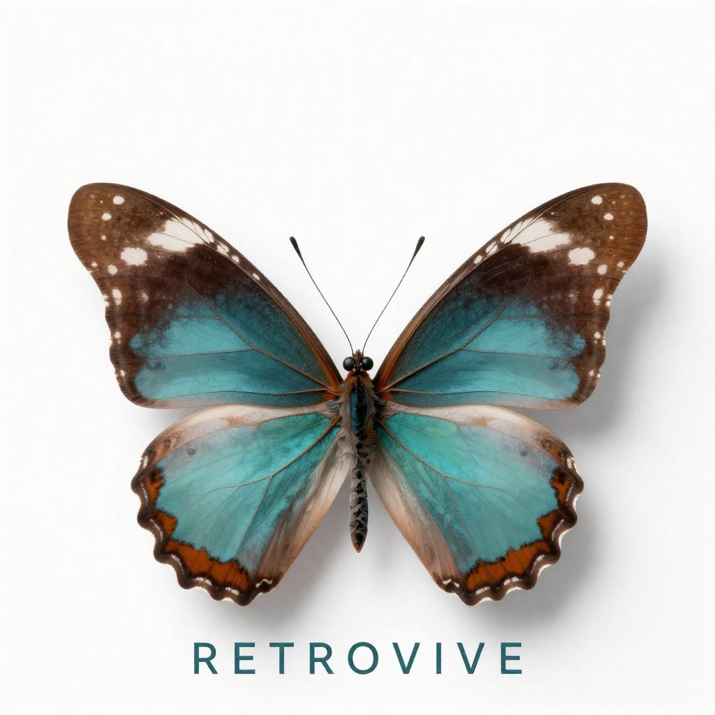 A digital illustration of a butterfly with intricately layered, multicolored wings in shades of teal, brown, and orange. The wings have a sleek, modern design with a slight 3D effect. The butterfly is centered on a white background, creating a clean and minimalistic look. Below the butterfly, the word "RETROVIVE" is written in a sleek, uppercase font.