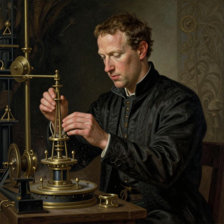 A 13 th century, enigmatic, melancholic, mark zuckerberg look like mark zuckerberg , is building a machine . light dust, magnificent, hyperdetailed, theatrical, painted by gustave dore