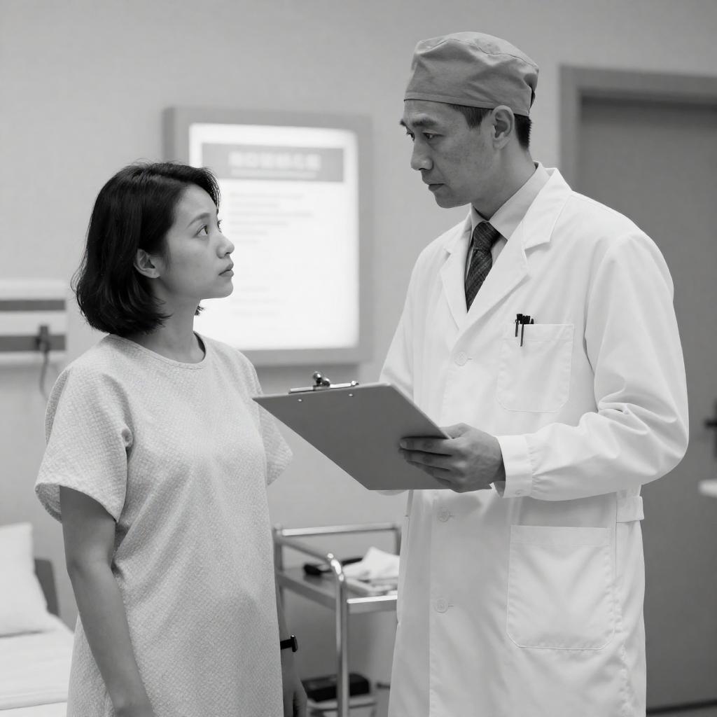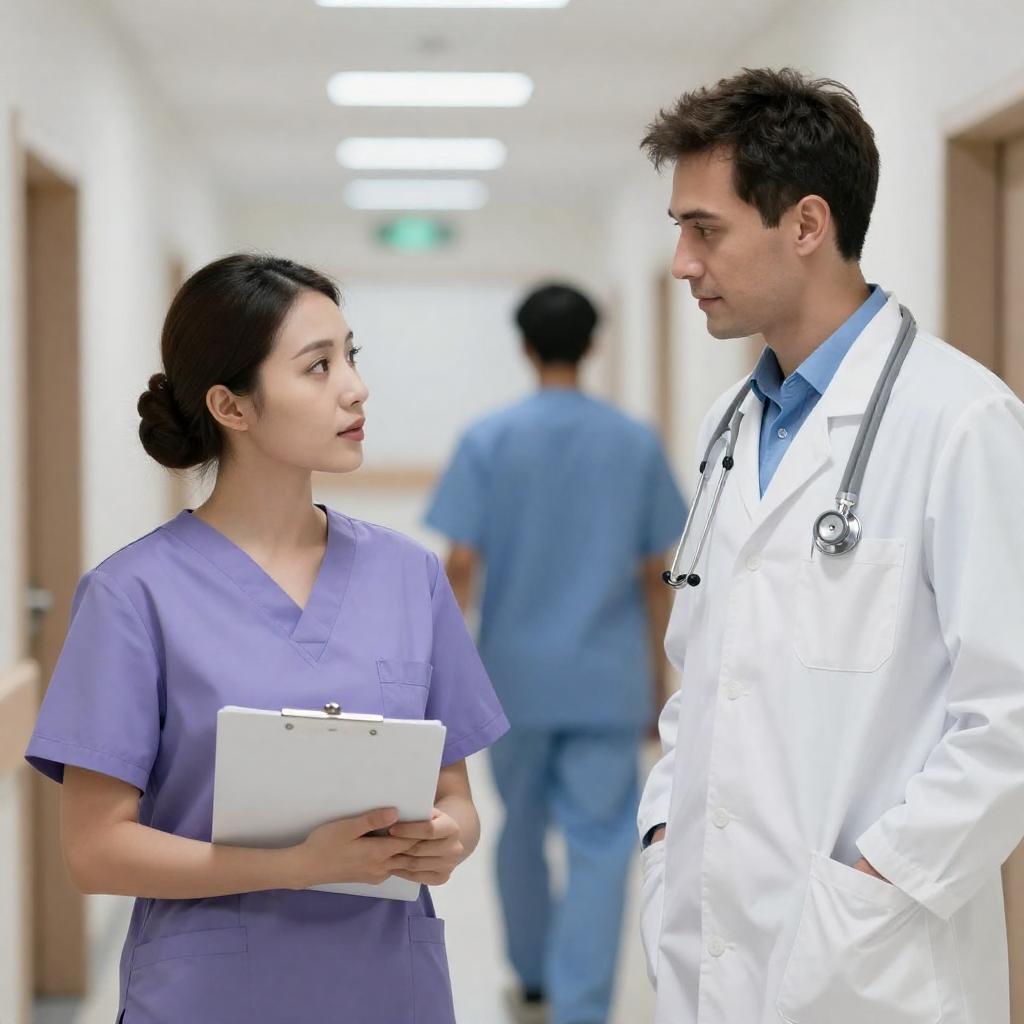 Photograph of a hospital corridor. Two people in the foreground: a female nurse with dark hair in a bun, wearing a purple scrub top, holding a clipboard, looking at a male doctor with short brown hair, wearing a white lab coat over a blue shirt, stethoscope around his neck. Background: another person in a blue scrub top walking away. Bright, even lighting.
