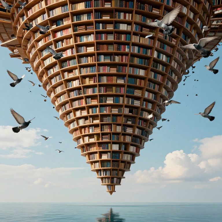 A colossal, spiraling library defies gravity as it hangs upside-down in the sky, its shelves brimming with books while flocks of pigeons swirl around it like living thoughts, all set against a serene landscape mirrored in a tranquil sea below.