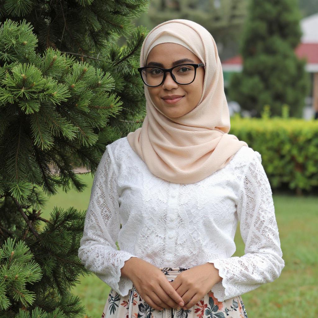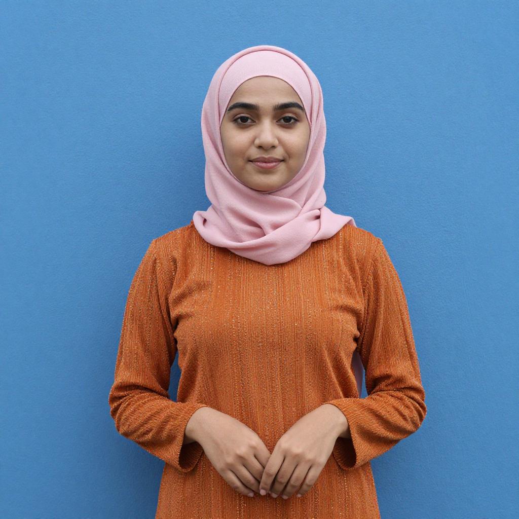 Photograph of a young woman with light skin and brown eyes, wearing a yellow hijab and a blue and yellow floral shirt. She sits on a red patterned couch, holding her hijab with one hand and wearing a black wristwatch on the other. A green wall and ornate brown fabric are in the background.