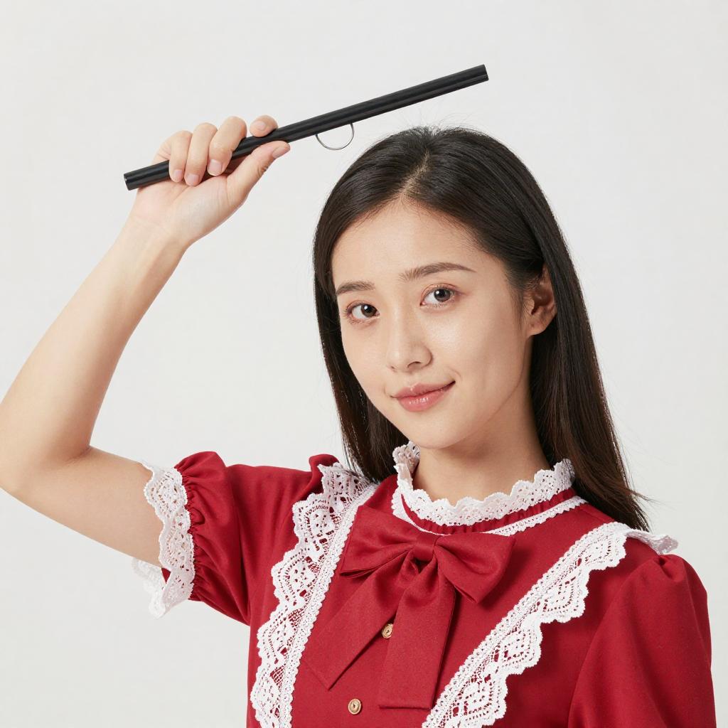 Photograph of an Asian woman with fair skin and straight black hair, wearing a red dress with white lace trim and a large red bow. She holds a black stick above her head with her right hand, looking directly at the camera with a slight smile. The background is plain white.