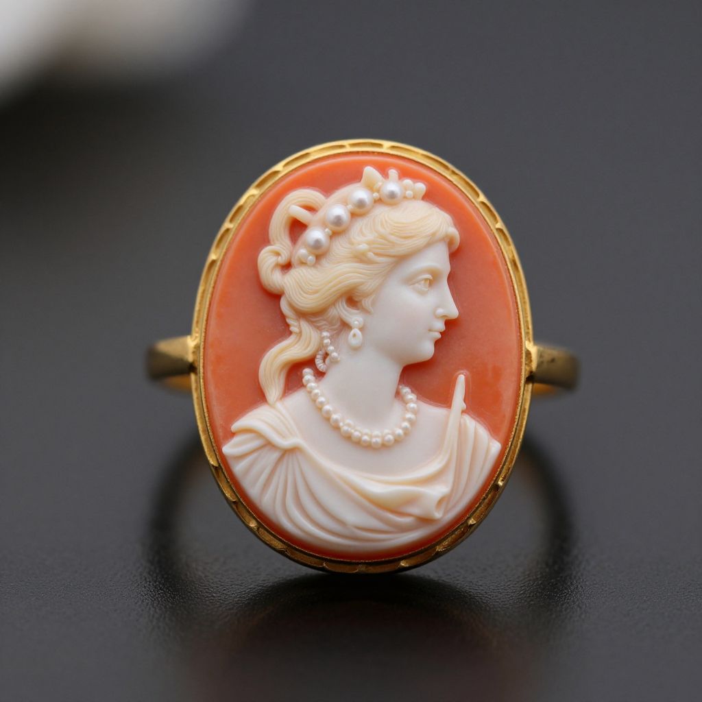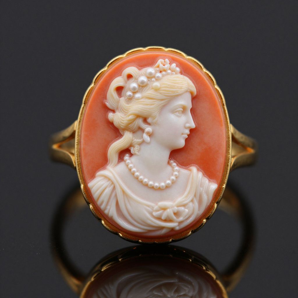 Photograph of an intricately carved cameo brooch featuring a profile of a regal woman with fair skin and blonde hair adorned with pearls. She wears a pearl necklace and a delicate crown, dressed in an elegant, draped white gown. The cameo is set in an oval frame of orange-red coral, with a gold border and gold ring. The background is a reflective black surface, enhancing the cameo's vibrant colors and detailed craftsmanship. The overall style is classical and elegant, exuding a timeless, royal aesthetic.