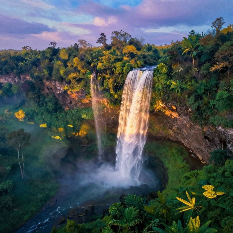 Envision an aerial perspective of a tranquil landscape, reminiscent of impressionist masterpieces. A magnificent waterfall tumbles down a verdant cliff face, its glistening mist weaving a vibrant spectrum across the scene. The surrounding panorama is a harmonious blend of colors, with soft strokes of azure and violet hues adorning the sky, while golden sunlight filters through the foliage, casting dappled shadows on the lush forest floor below. This captivating vista encapsulates both the serenity of nature and the ephemeral allure of light, enticing viewers to immerse themselves in its emotional spectrum of peace and awe.