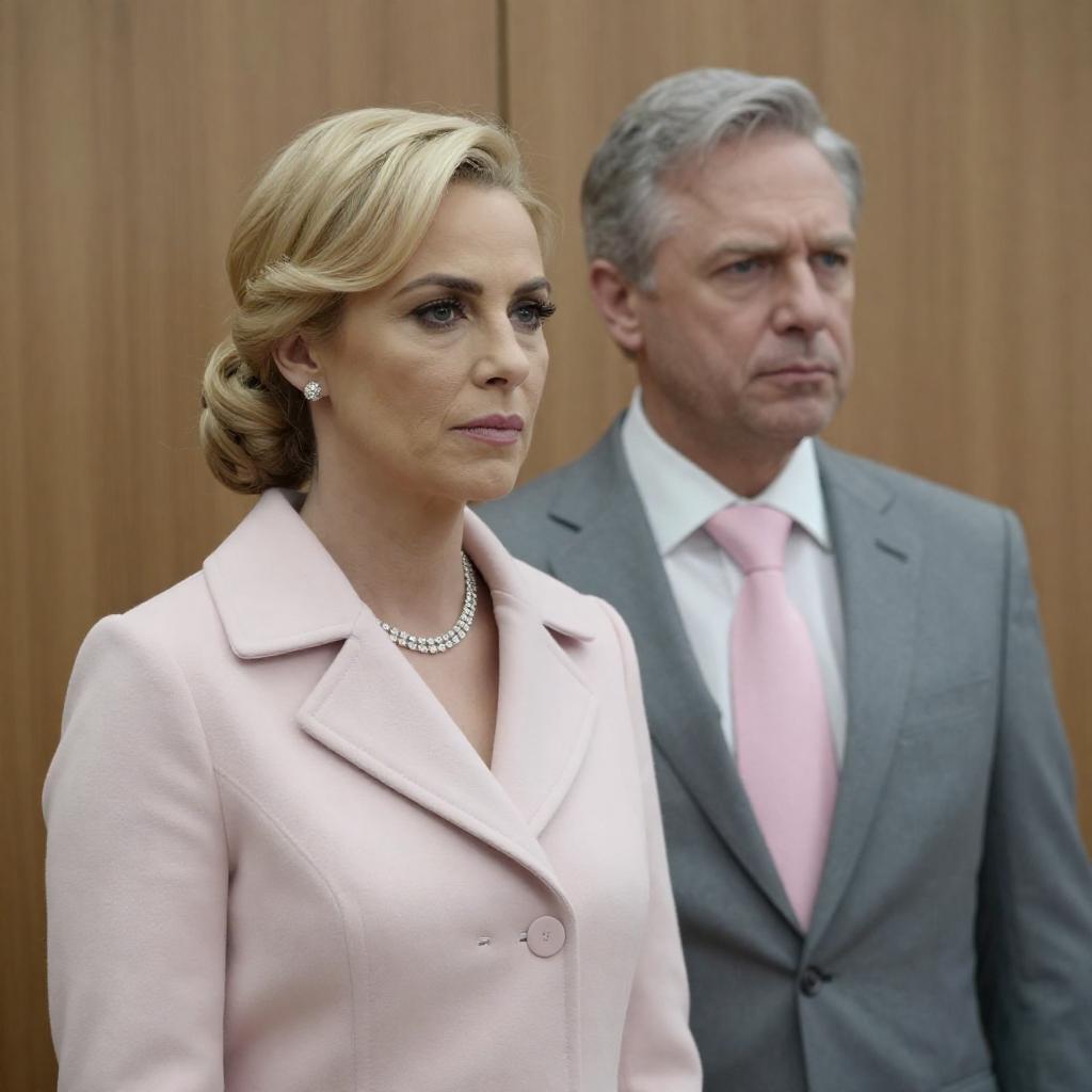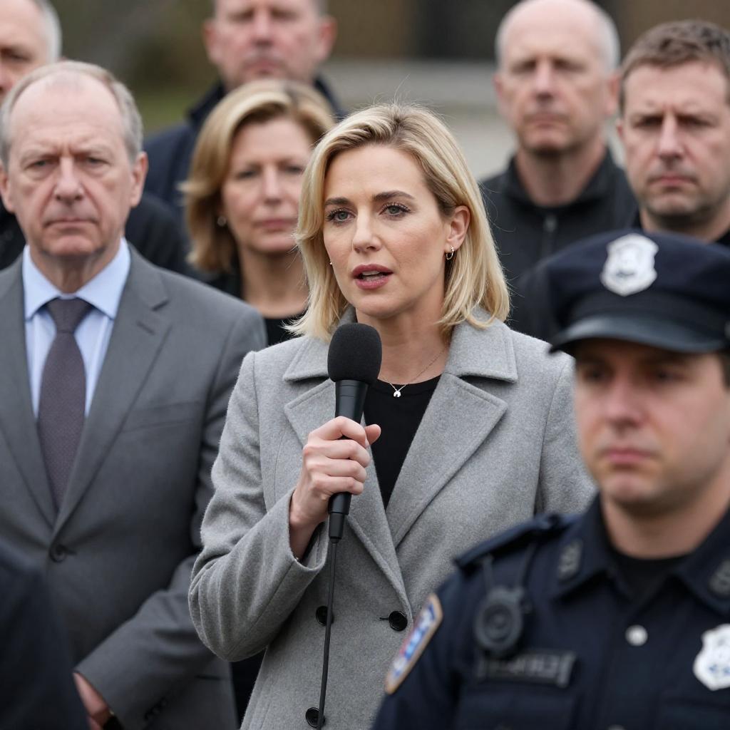 A fair-skinned blonde woman wearing a gray coat speaks into a microphone at a public event. She has light makeup and a focused expression. Behind her are several serious-looking individuals including an older man in a gray suit and an older woman in black clothing. In the foreground, a police officer in a black uniform and cap stands partially visible, signifying official presence. The setting suggests a formal or official announcement or speech.