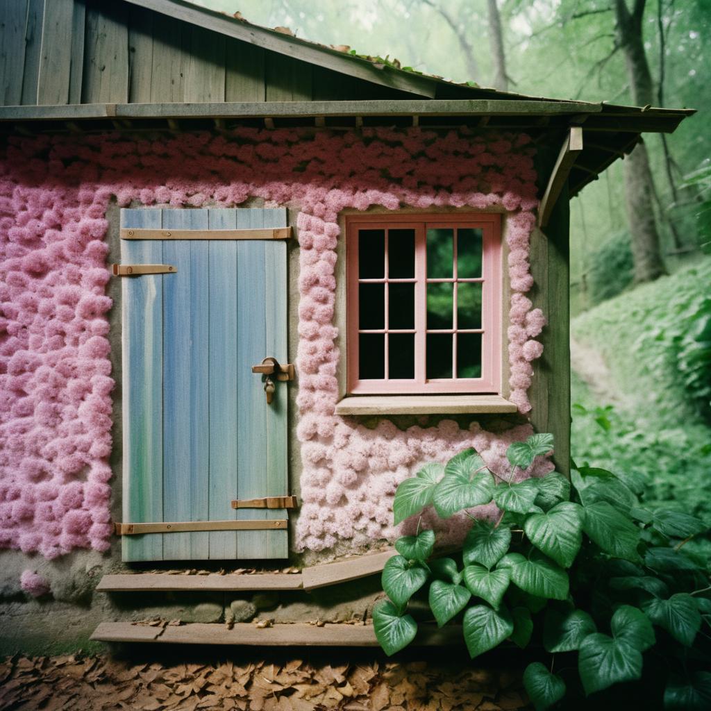 Flowing Wash une carabine rose posée sur un mur dans une cabane , colors photo essay, Fujifilm Superia 400, perfect faces, shot by roger deakins and Dan Colen, asymmetrical balance, intricate texture, perfect details, film grain, analog photograph, shot on Phase One camera,