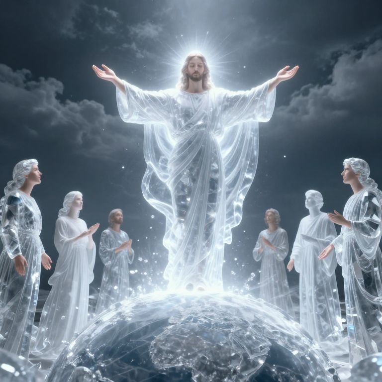 The image depicts a surreal and ethereal scene of the Second Coming of Christ, portrayed as a crystalline consciousness spreading across the globe. The central figure, Jesus Christ, stands with outstretched arms, radiating a luminous, ethereal glow that permeates the entire scene. His body is draped in flowing, translucent robes, giving a sense of weightlessness and divine presence. Surrounding him are figures of various ages and genders, all appearing to be in a state of awe and reverence, as if witnessing a divine manifestation. The background features a dark, cloud-filled sky, contrasting sharply with the bright, crystalline figures, creating a dramatic and otherworldly atmosphere. The overall composition is balanced, with the central figure and the surrounding figures creating a harmonious and cohesive visual narrative. The use of light and shadow, along with the intricate details of the robes and the figures' expressions, adds depth and complexity to the scene, making it a powerful representation of the Second Coming.