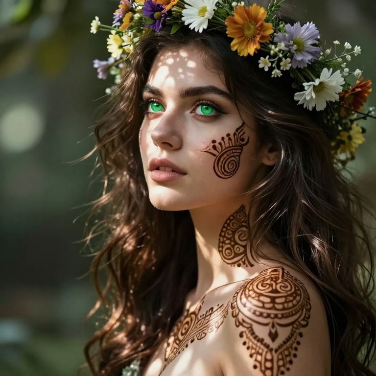 Craft an enchanting portrait featuring a captivating female subject with striking green eyes and flawless skin, adorned with intricate henna designs evoking ancient myths. She appears both alluring and mysterious as she looks into the distance beneath a crown of wildflowers, her untamed hair flowing over her shoulders. Soft, diffused light filters through the surrounding foliage, casting dappled shadows that highlight her enigmatic expression and create an ethereal atmosphere, inviting viewers to enter a realm where wonder and curiosity intertwine with magic and mortality.