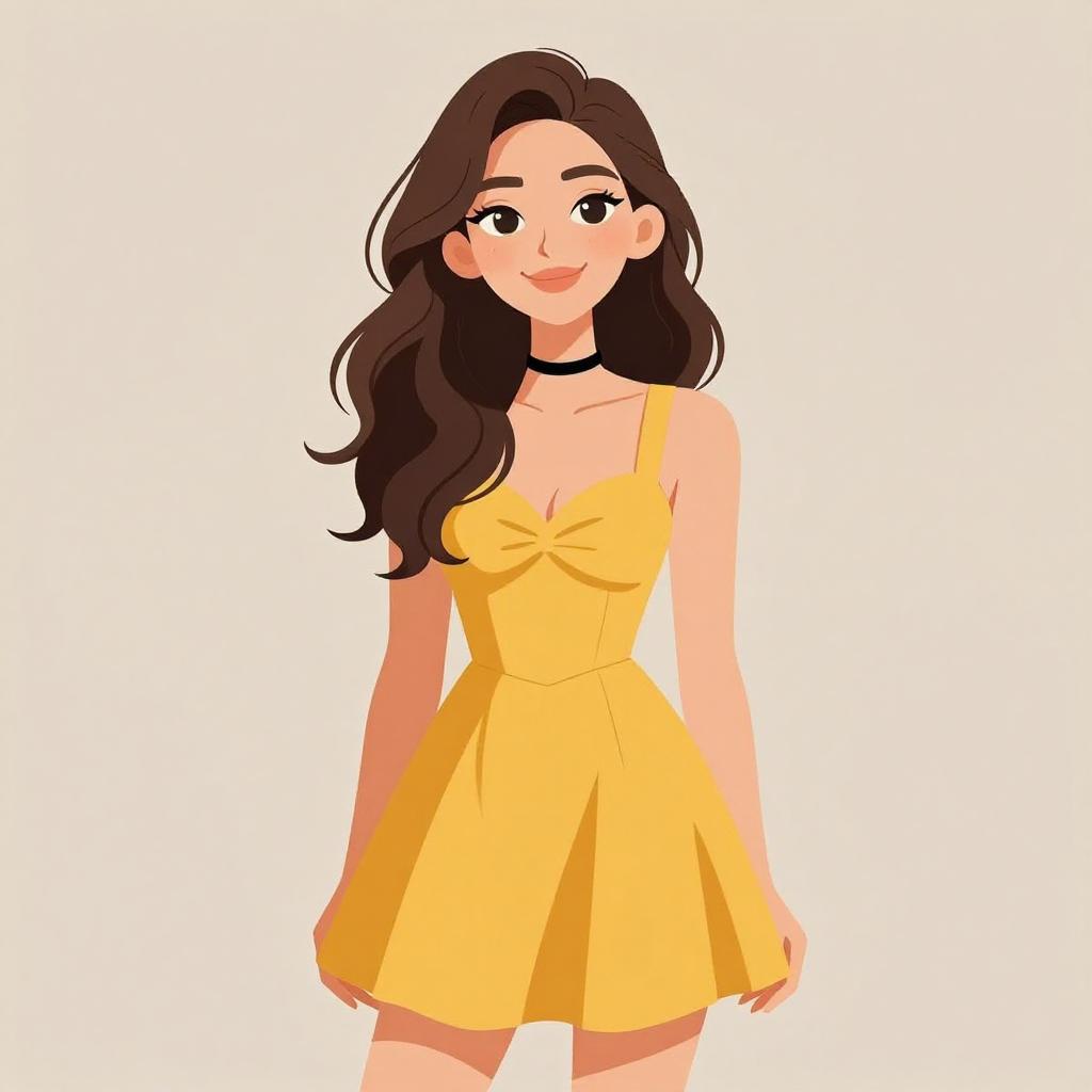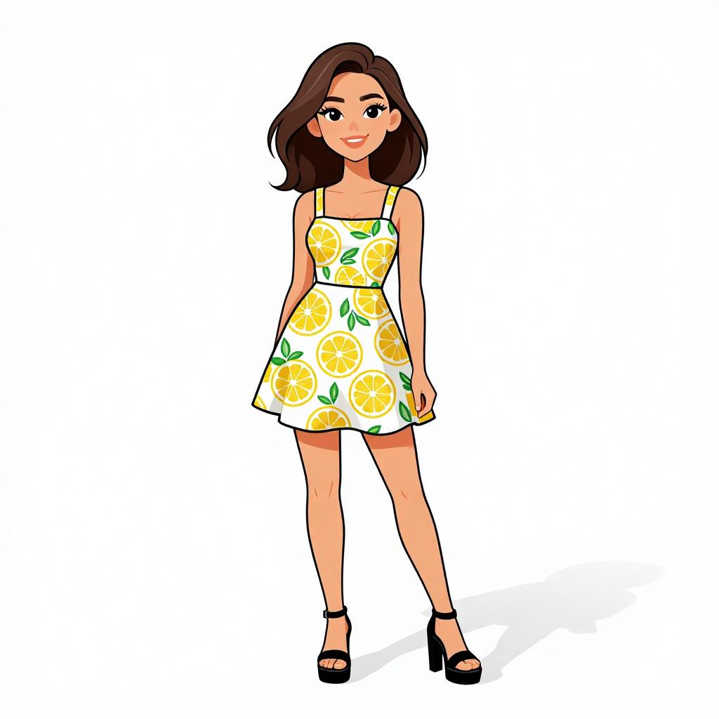 Woman with pretty face and pretty hair. smiling Woman, playful summer style, sleeveless mini dress with citrus fruit print in yellow and green, square neckline, thin straps, flared skirt, black chunky open-toe platform sandals, white background with soft shadow. --sref 1467