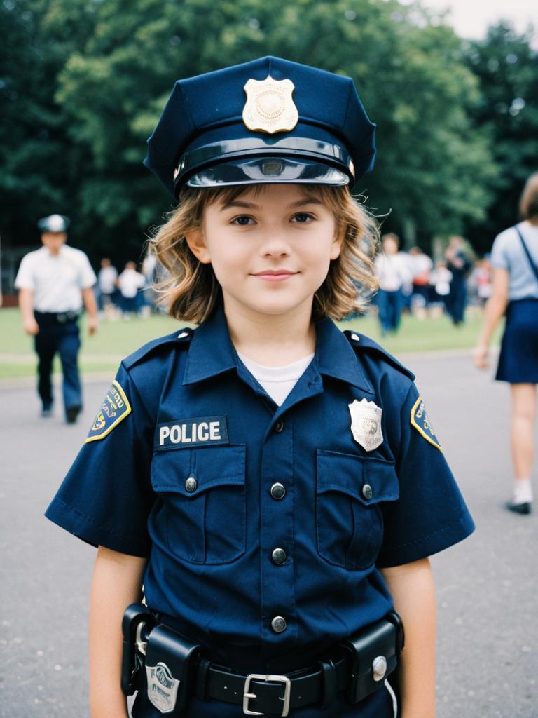Child in Police Officer Costume, candid cosplay portrait at school event