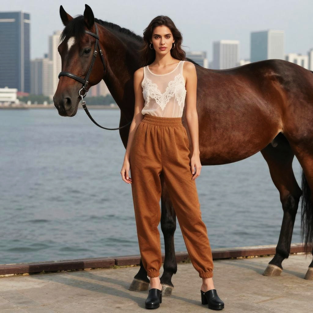 A woman, in a dark horse visual style, wearing a sheer ivory tank top with lace detailing tucked into warm earth-toned harem pants, black clog-style heels, standing on a pier with a city skyline in the background. Sexy. Pretty face and beutiful eyes