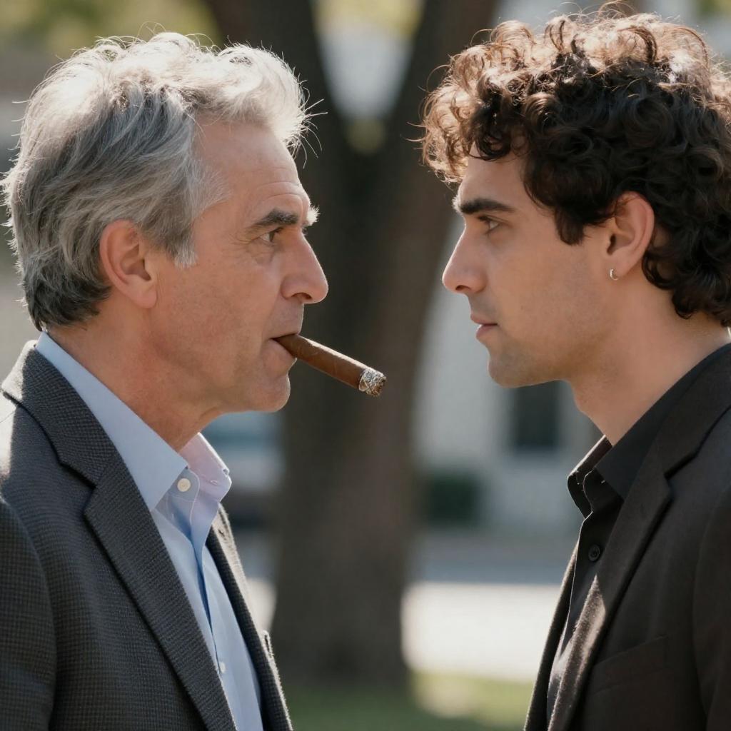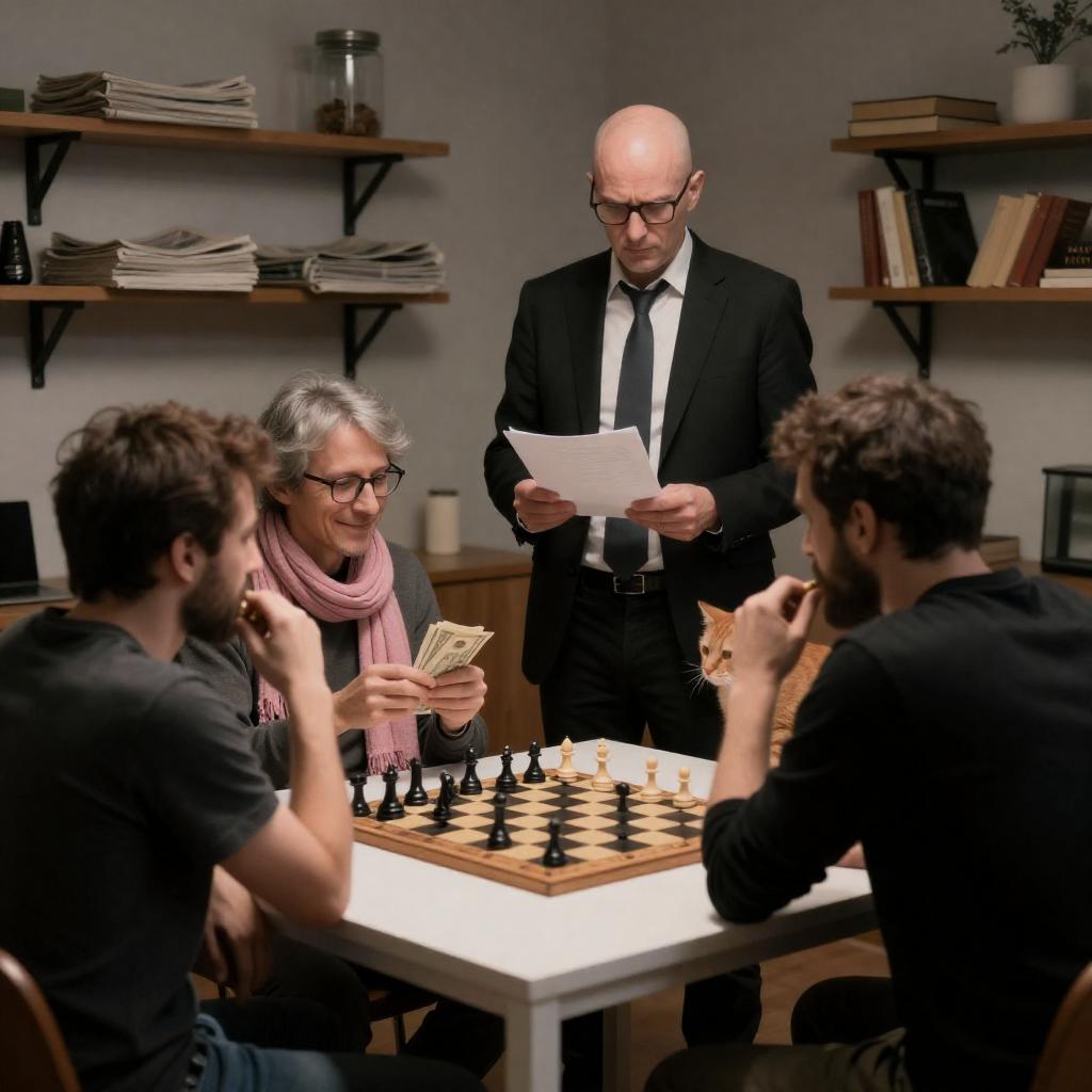 Photograph of two men playing chess. Bald man in black suit on left, older man with dark hair in white shirt on right. Chessboard on table between them. Dark background with vertical light reflections. Both men focused, intense expressions.