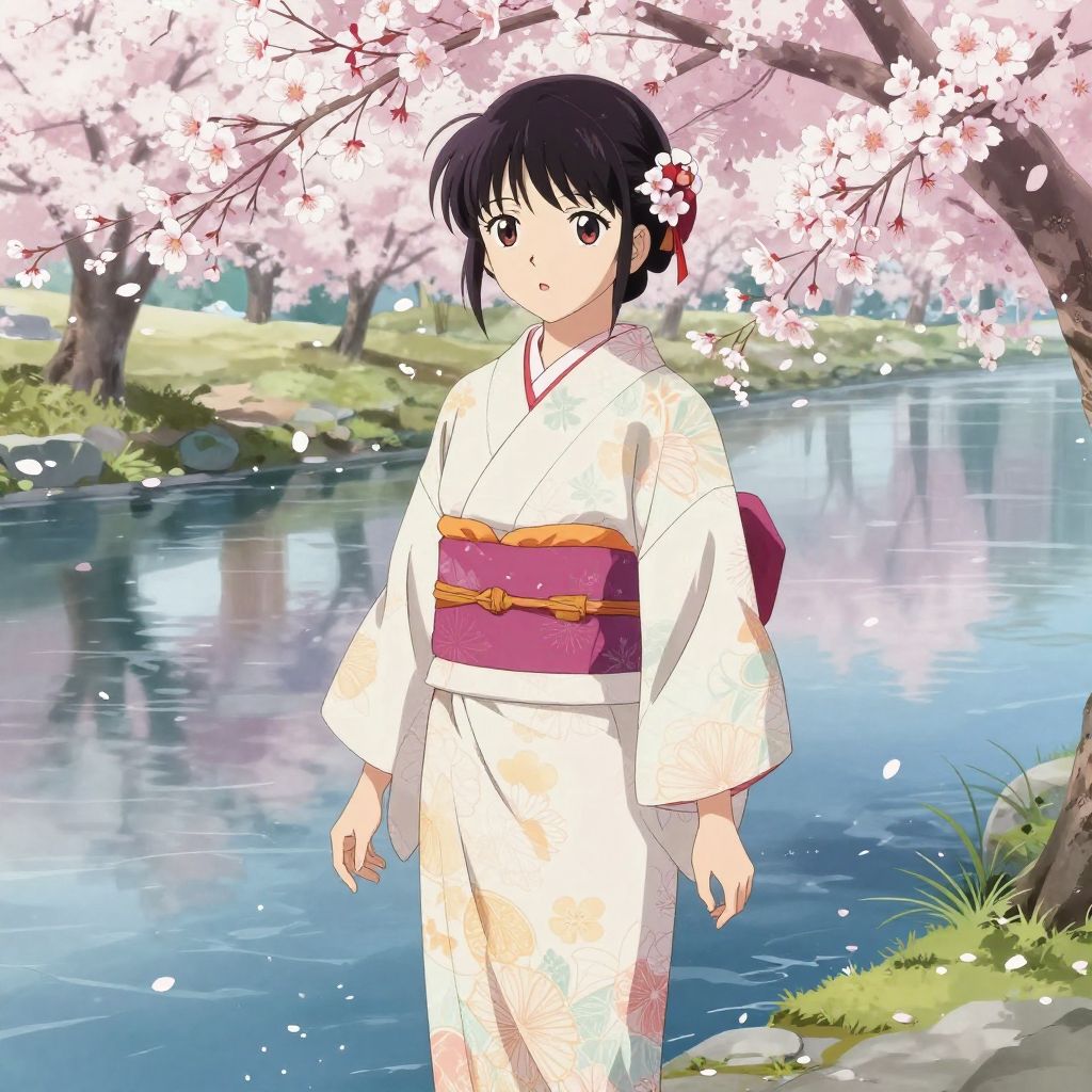 Water anime girl in a traditional kimono, standing near a tranquil river, cherry blossoms drifting around, calm water reflections, soft pastel colors, intricate linework anime style