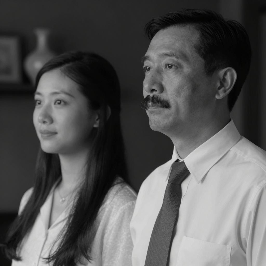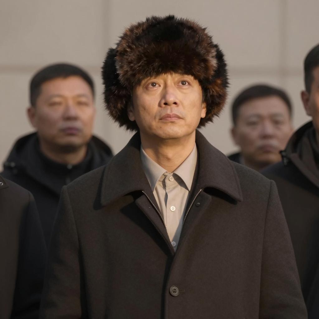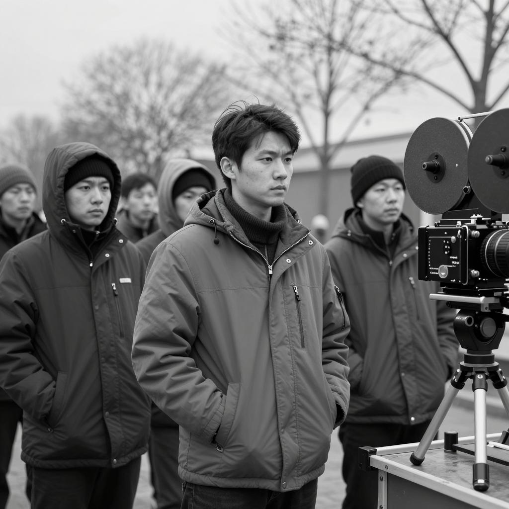 Black and white photograph of a crowded group of people in winter clothing, including hats and fur-lined coats. Men and women, serious expressions. Background includes more people and a bus. Central figure in middle foreground, intense gaze. 13 people.