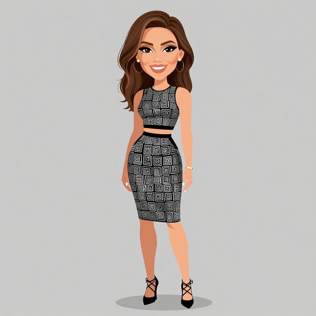 Woman with pretty face and pretty hair. smiling Woman, casual, sleeveless sheath dress with zigzag chevron pattern in brown, black, white, and orange, knee-length, round neckline, brown strappy heels, gold bangle, small gold earrings. --sref 1467