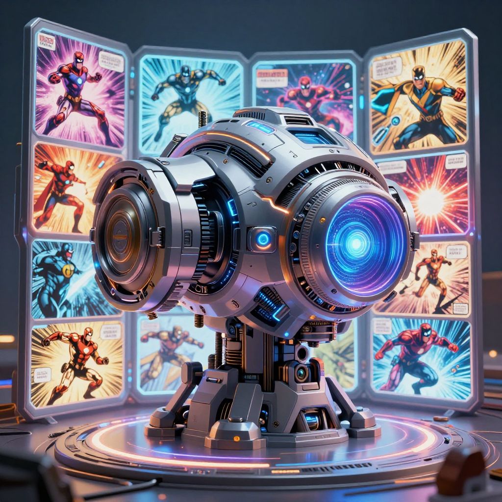 Marvel comic generator concept art, a futuristic machine surrounded by glowing panels showing dynamic comic strips with superheroes in action, vibrant colors, high detail, cinematic lighting, digital art style