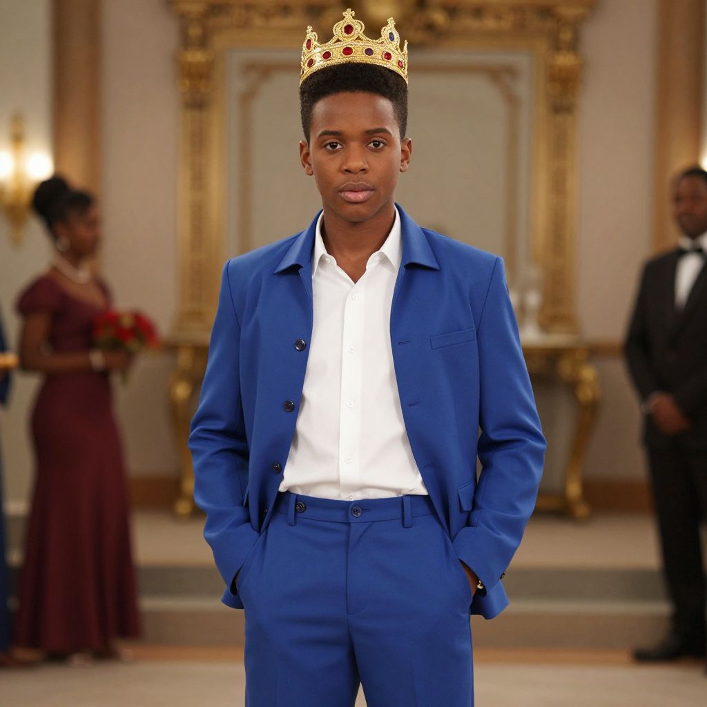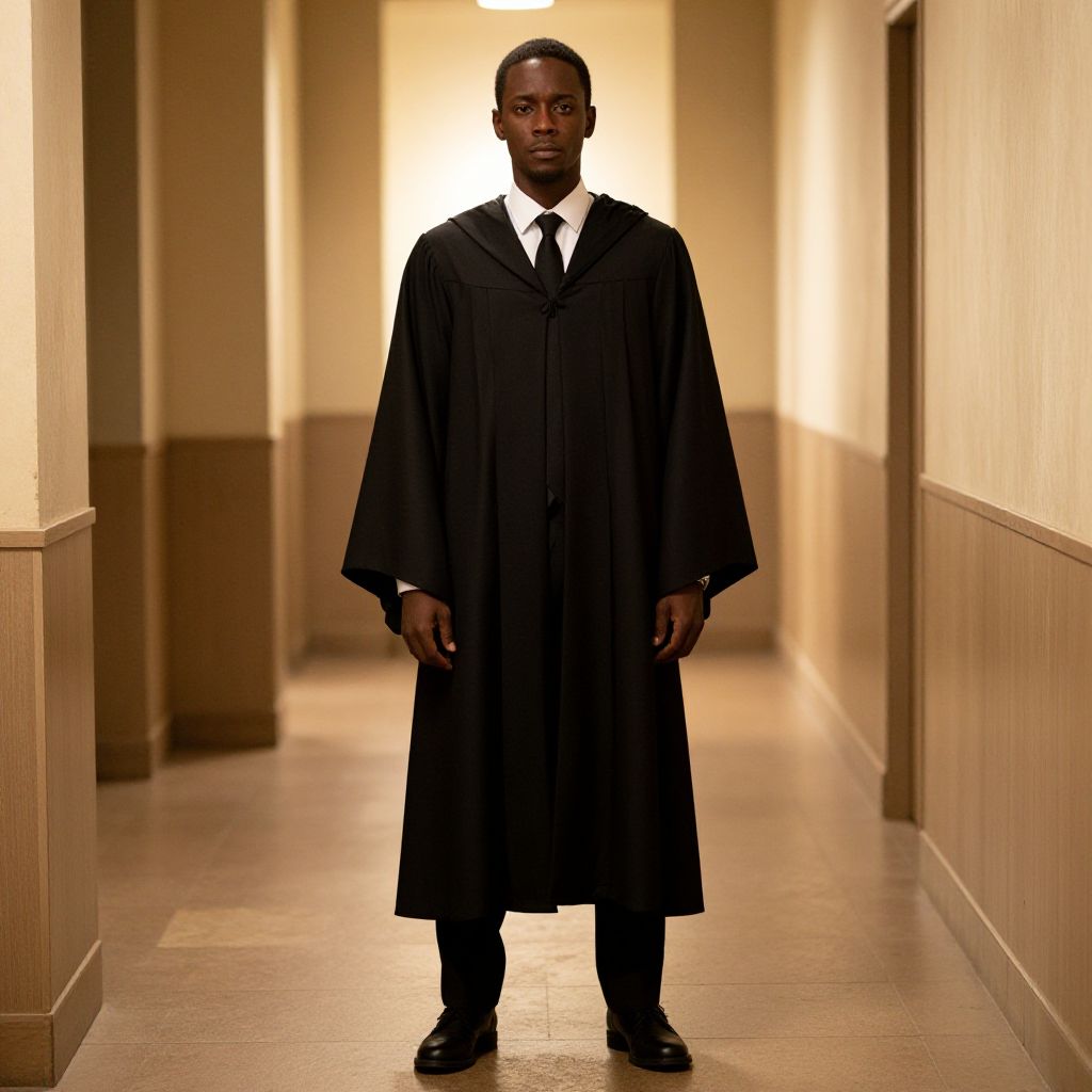 Photograph of a Black man standing in a dimly lit, narrow hallway with beige walls and wooden paneling. He is wearing a long, black academic gown over a white shirt and black tie, with black pants and shoes. His expression is serious, and he is centered in the frame, facing the camera. The hallway has a bright light source behind him, creating a strong backlight effect that highlights his silhouette against the otherwise muted background. The image has a formal, solemn atmosphere.