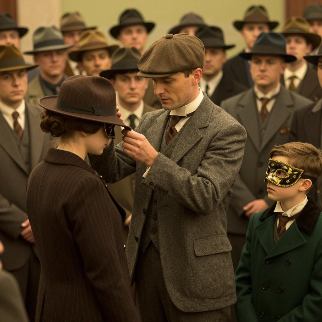 Group of seven men in 1940s-style clothing playing chess outdoors. Five standing, two kneeling. Kneeling man in brown checkered coat. Standing man with plaid shirt, dark hair, and hands in pockets. Others in various coats and hats. Chessboard on a wooden box. Stone building in background. Overcast sky.