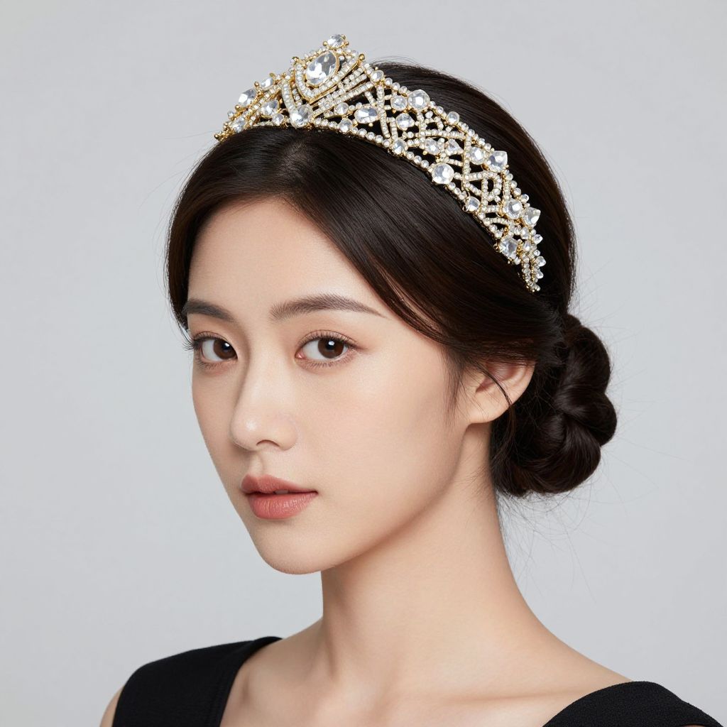 Elegantly styled woman wearing a sparkling art deco headpiece adorned with crystal and gold beading, complemented by a chic updo and soft makeup, exuding timeless sophistication.
