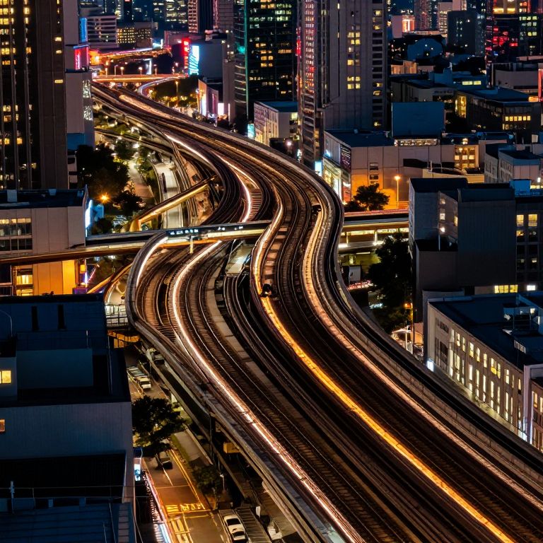 Aerial view of complex subway tracks weaving under a metropolitan city, intricate network of rails and stations, illuminated at night with city lights, high detail, vibrant and dynamic composition