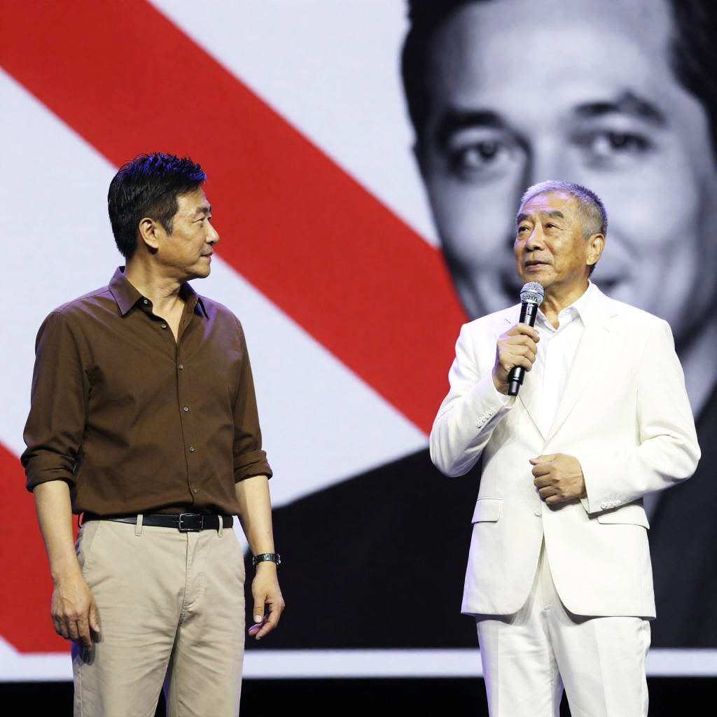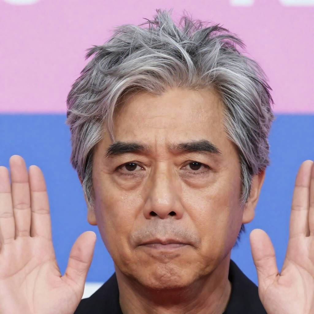 Middle-aged man with gray hair, wearing a navy blue t-shirt, holding a microphone in his right hand, standing against a gray background. He has a slight smile, relaxed expression, and is positioned in the center of the frame.