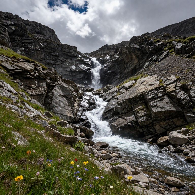 Brookshield cascading down rugged rocky slopes in a remote mountain valley, sunlight glinting off the sparkling water, wildflowers blooming along the banks, dramatic clouds overhead, evoking a sense of untouched natural beauty and serene wilderness.
