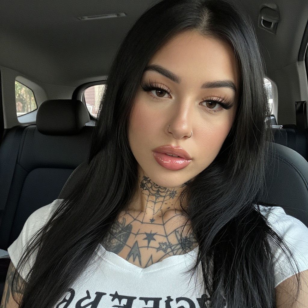 Photograph of a young woman with long, straight black hair and light olive skin, sitting in a car's backseat. She has prominent, full lips with glossy pink lipstick, dark, well-defined eyebrows, and long, thick false eyelashes. She wears a white t-shirt with black text, and a nose ring in her left nostril. Her chest and neck are adorned with intricate black tattoos, including a spider web on her neck and stars across her chest. The car's interior is dark with black seats, and a faint window view is visible in the background. The lighting is natural, highlighting her features.