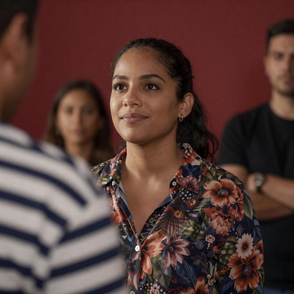 Photograph of a young woman with medium brown skin and straight black hair, wearing a maroon cardigan over a pink floral blouse. She has a serious expression, looking slightly to the right. The background is softly blurred with warm, orange lighting. A blurred white figure is partially visible in the foreground on the right.