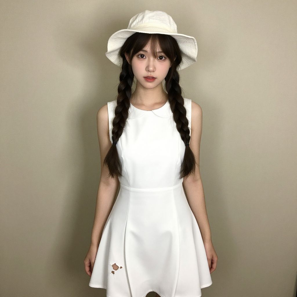 Photograph of an Asian woman with fair skin and long black hair in two braids, standing against a plain beige background. She wears a sleeveless, white, A-line dress with slight stains on the lower right side and a white wide-brimmed hat. Her expression is neutral, with slightly parted lips and dark, almond-shaped eyes. The lighting is even, highlighting the simplicity of her outfit and the texture of her dress. The overall style is minimalist and modern.
