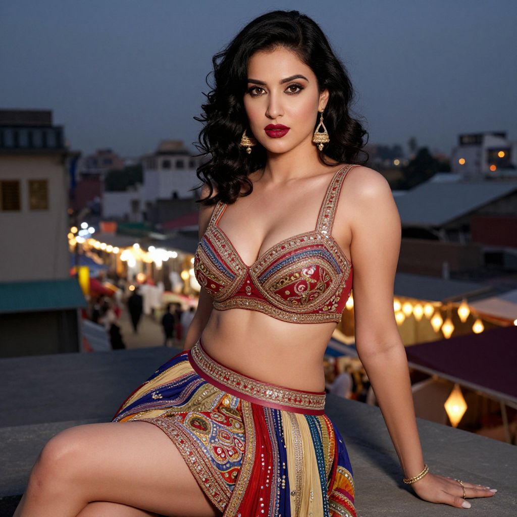 A glamorous woman with deep red lips, wavy jet-black hair, and almond-shaped hazel eyes dressed in a festive short skirt lehenga choli costume, seated on a rooftop overlooking a night market in Rajasthan, lanterns glowing in the evening sky, natural lighting, realistic portrait style. The woman has big breasts and cute face