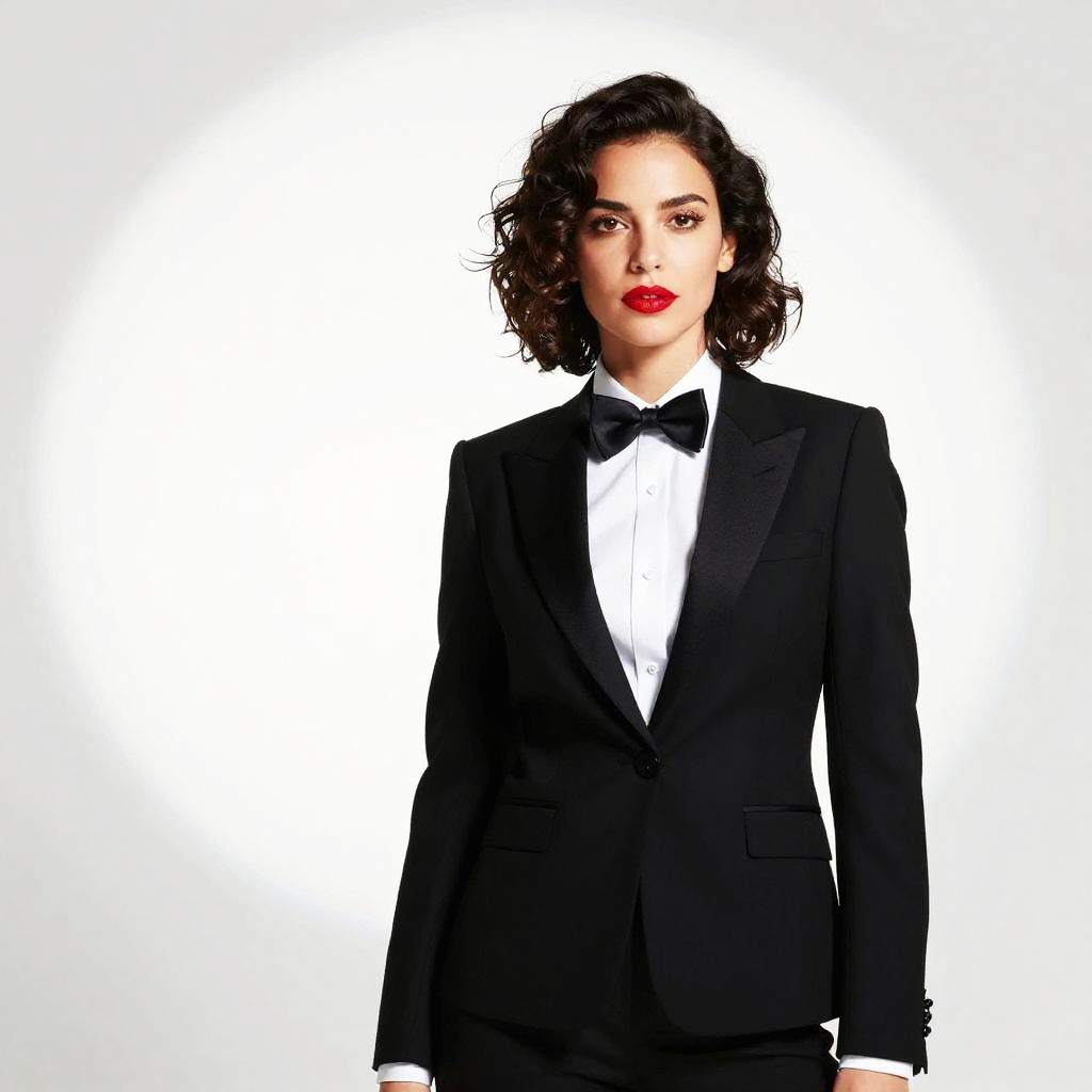 Photograph of a confident woman with dark, curly hair and bold red lipstick. She's wearing a sleek black tuxedo with a white dress shirt and black bow tie, standing against a bright white circular light backdrop. Her pose is strong and poised, with a slight tilt to her head. The overall style is classic and sophisticated, with a modern twist.