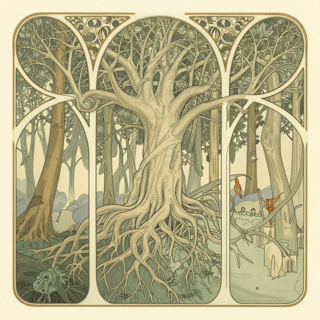 Art Nouveau-style illustration of a large, intricately rooted tree with three arched panels; a person and a white dog in the right panel,