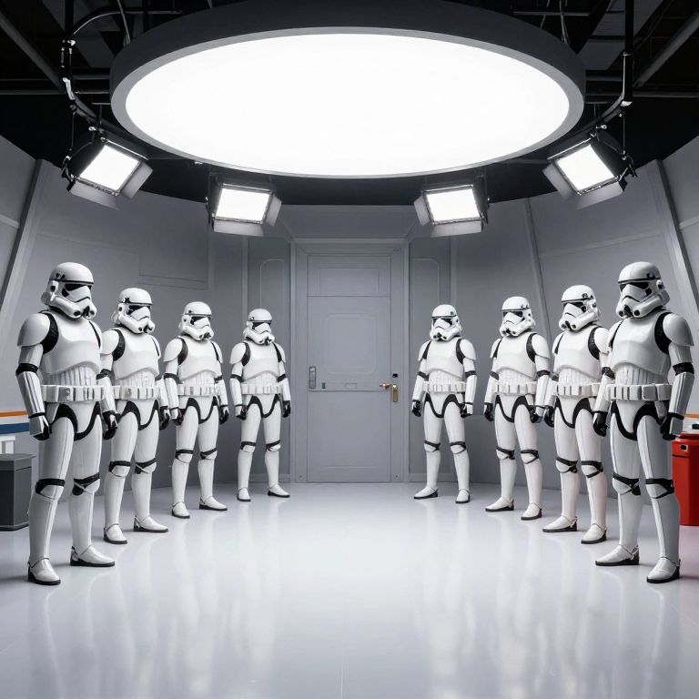 Photorealistic digital illustration of eight Stormtroopers in white armor standing in a brightly lit, futuristic room with a circular overhead light and gray walls.
