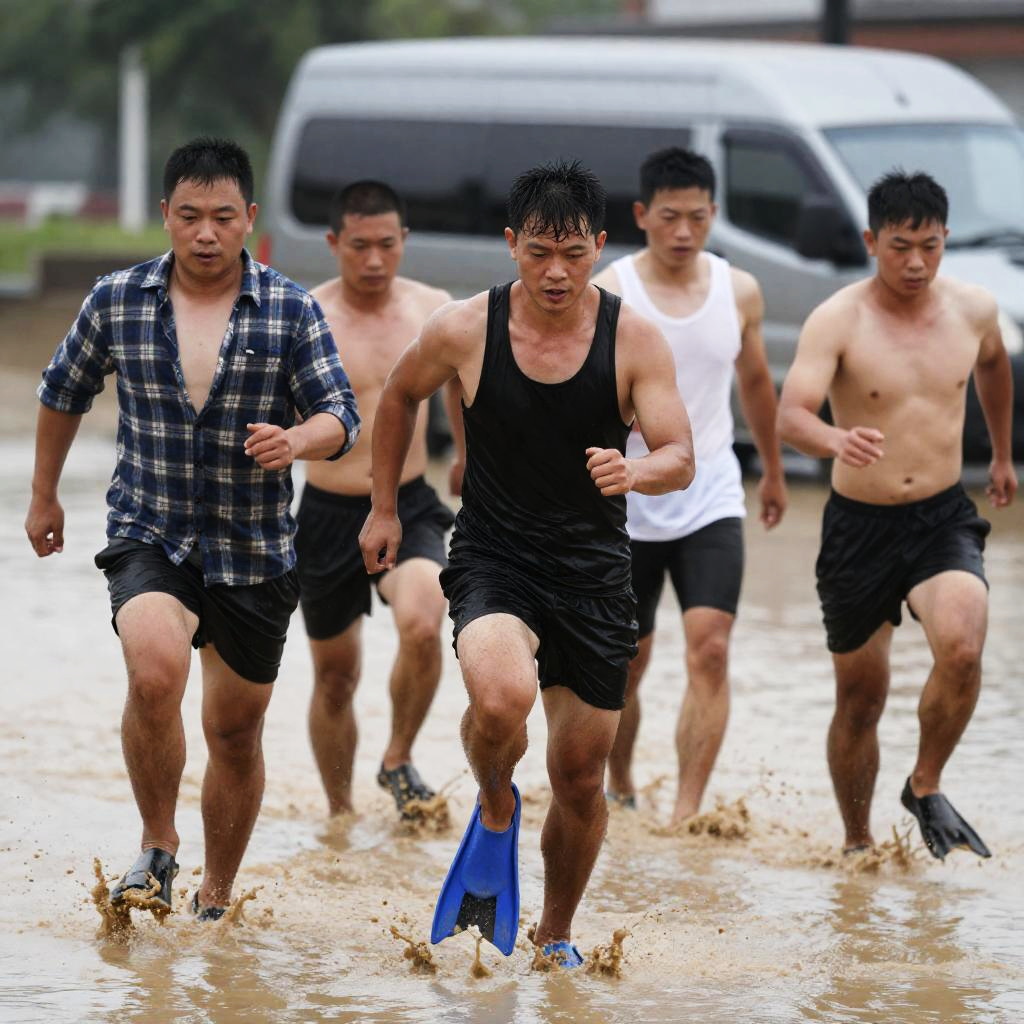 Photograph of six Asian men running through a muddy flood. Front man in black tank top and blue flippers, intense expression. Man to left in plaid shirt, medium build, looking forward. Other men in various clothes, focused expressions. Splashing mud, grey van in background. Urban setting.
