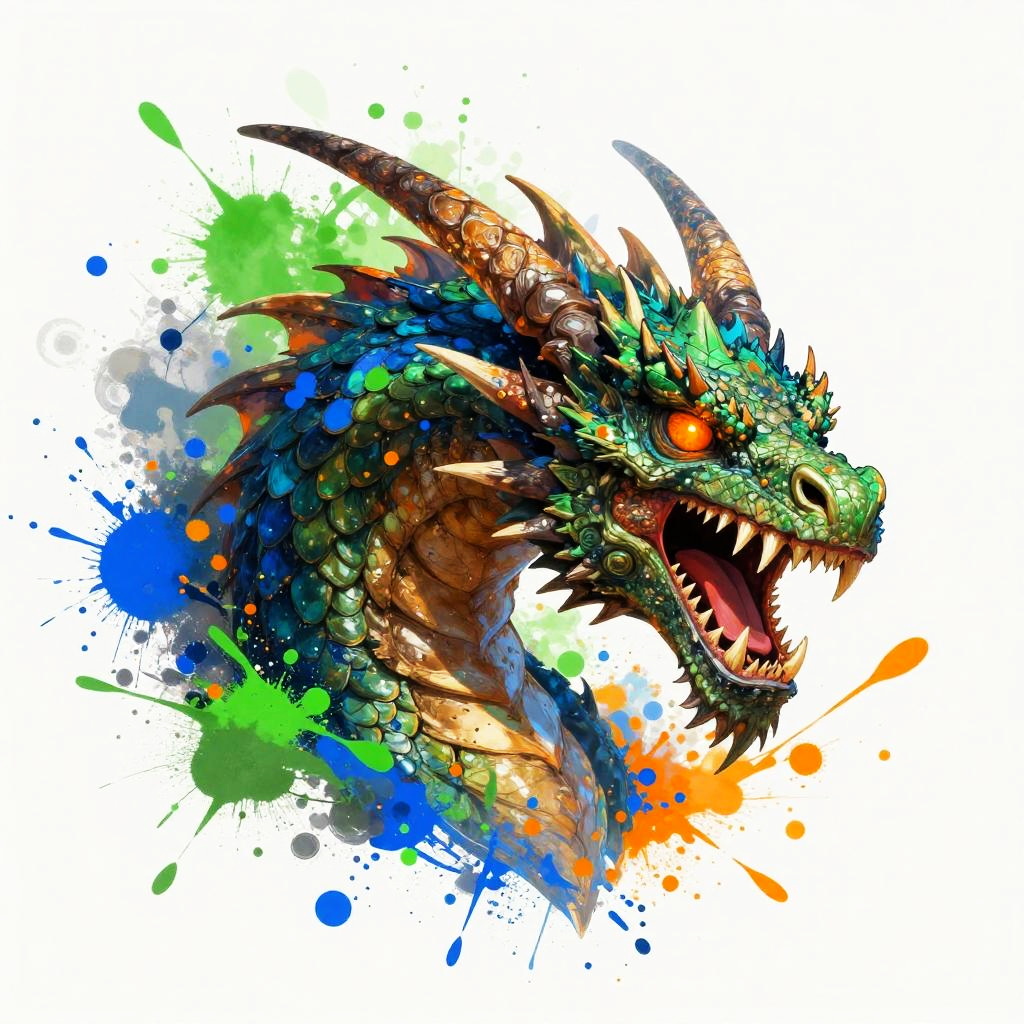 Digital artwork of a vibrant, fierce dragon head with intricate scales in green, blue, and orange hues. The dragon has sharp, curved horns, glowing red eyes, and an open mouth revealing sharp teeth. Splashes of green, blue, orange, and white paint surround the dragon, adding a dynamic, energetic feel. The background is stark white, making the colorful dragon and paint splatters stand out. The style is bold and vivid, with a mix of realism and abstract elements, emphasizing the dragon's fierce expression and detailed textures.