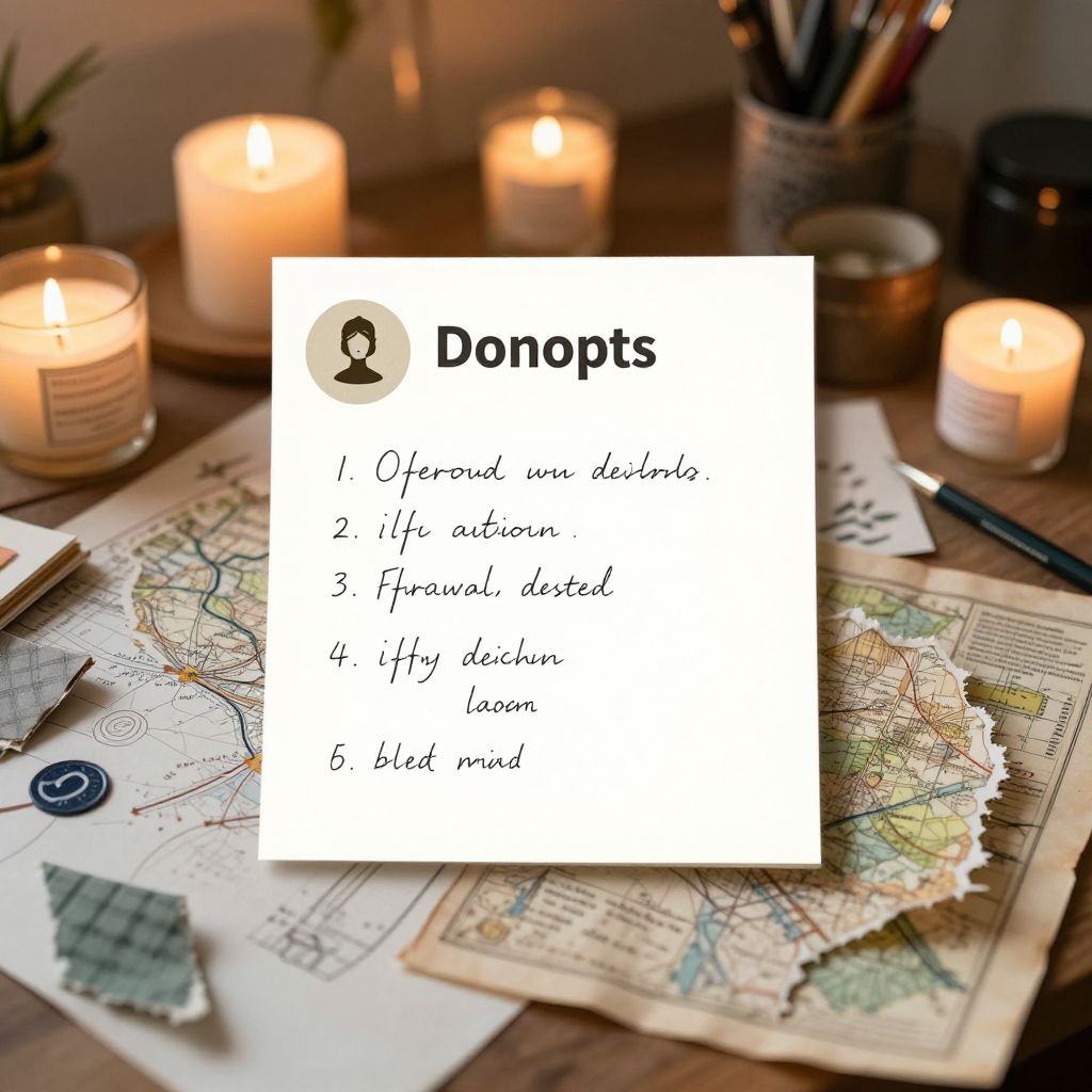 Photograph of a wooden table setup for map-making. Centered is a white sheet with black handwritten text: "5 Donuts" and a list: 1. Often confused, 2. Iffy assistance, 3. Frustrated, 4. Ugly decision, 5. Blasted mind. Background includes four lit candles, a pen, and a map partially torn at the edge. The candles cast warm light, and the map shows detailed, colorful routes. The overall scene is cozy and inviting, with a focus on the handwritten list over the map-making activity.