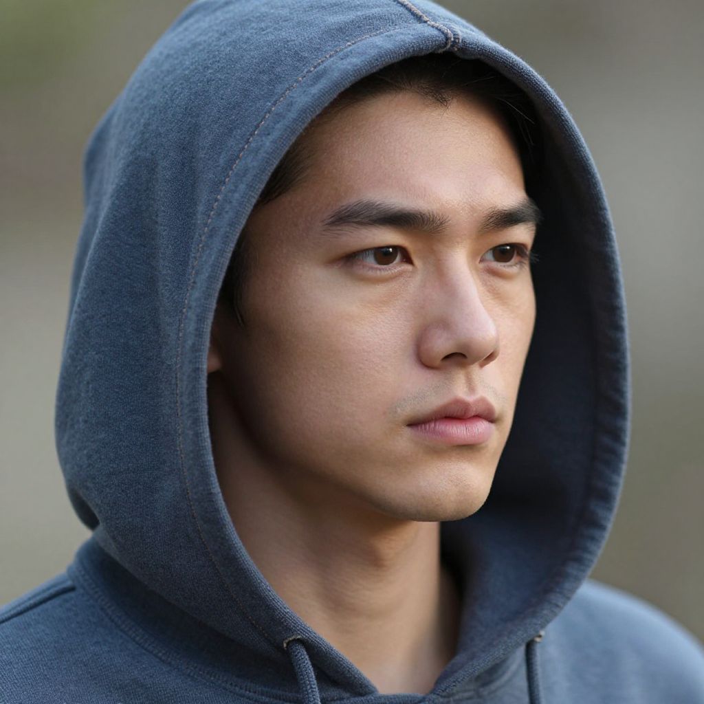 Photograph of a young Asian man with short black hair, wearing a black beanie, gray overcoat, and black-and-white striped scarf, standing