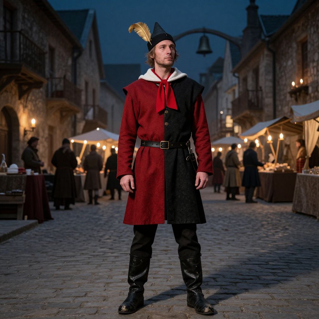 A man in a medieval costume stands on a cobblestone street, surrounded by dimly lit stone buildings and flickering candlelight. He is tall and lean with a weathered face, wearing a red and black outfit with a red scarf tied loosely around his neck and a white scarf wrapped around his lower neck, adding contrast to his attire. He dons a pointed hat adorned with a golden feather on top, giving him a noble yet rugged appearance. His black leather boots are slightly worn, showing signs of travel, and he stands with a calm, introspective expression, as if observing the scene with quiet wisdom. The background features a bustling market with distant sounds of merchants and distant church bells, adding to the atmosphere of a lived-in medieval town.