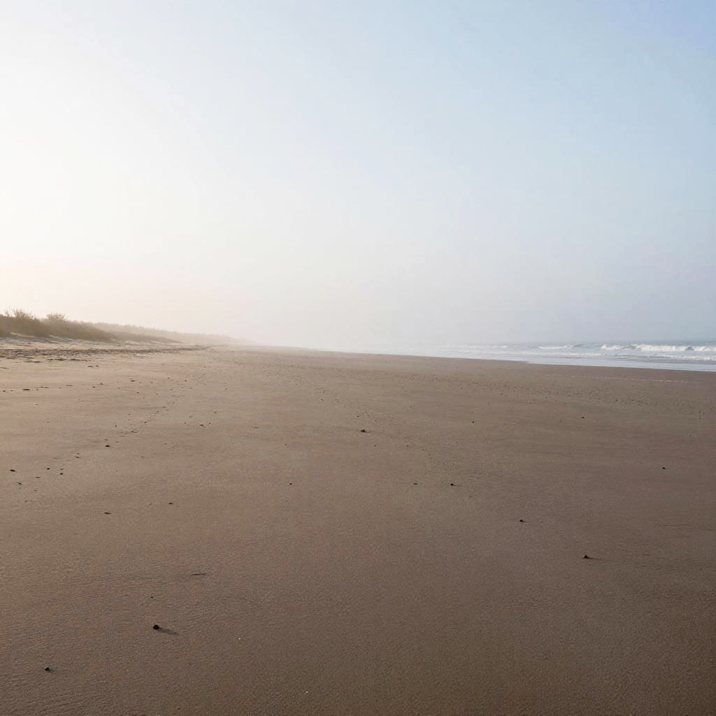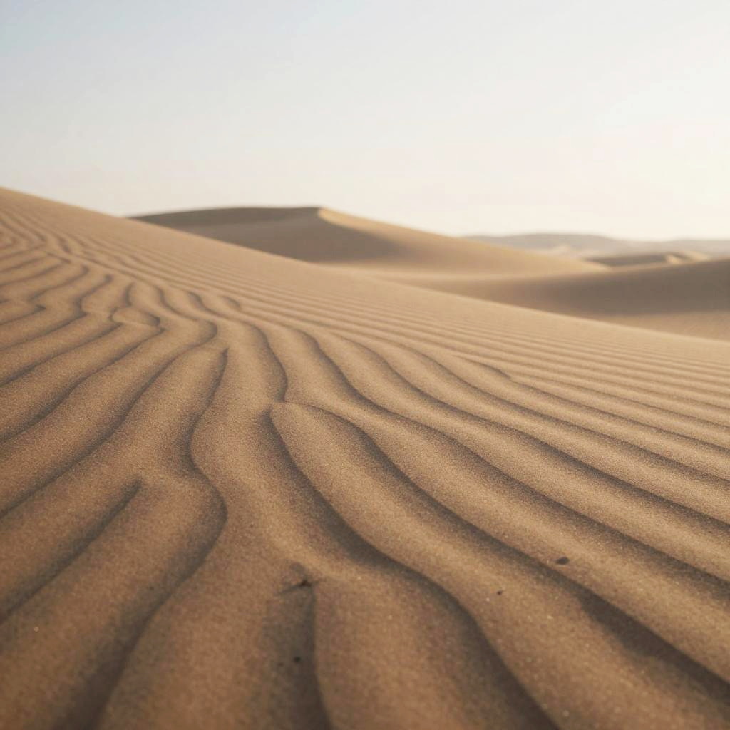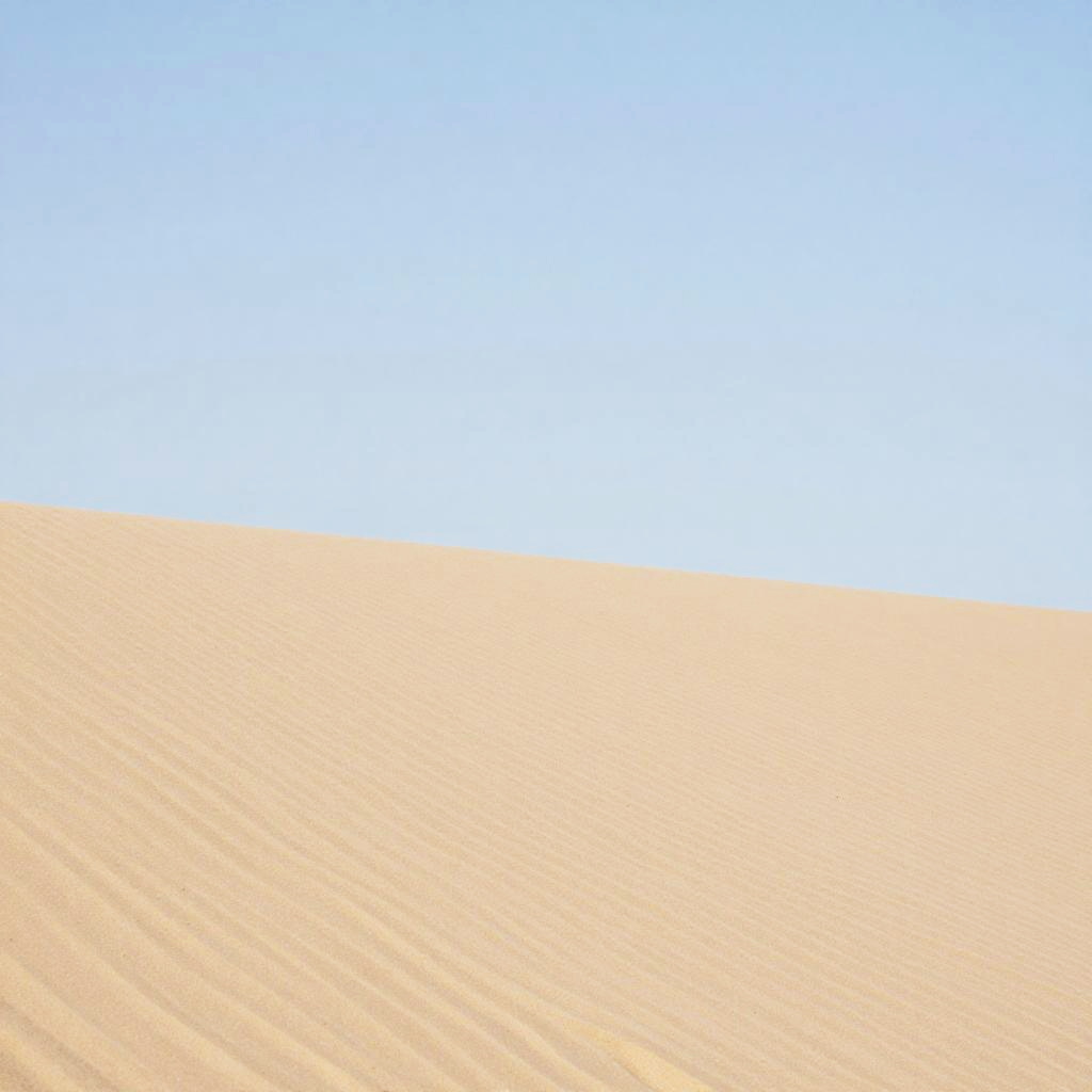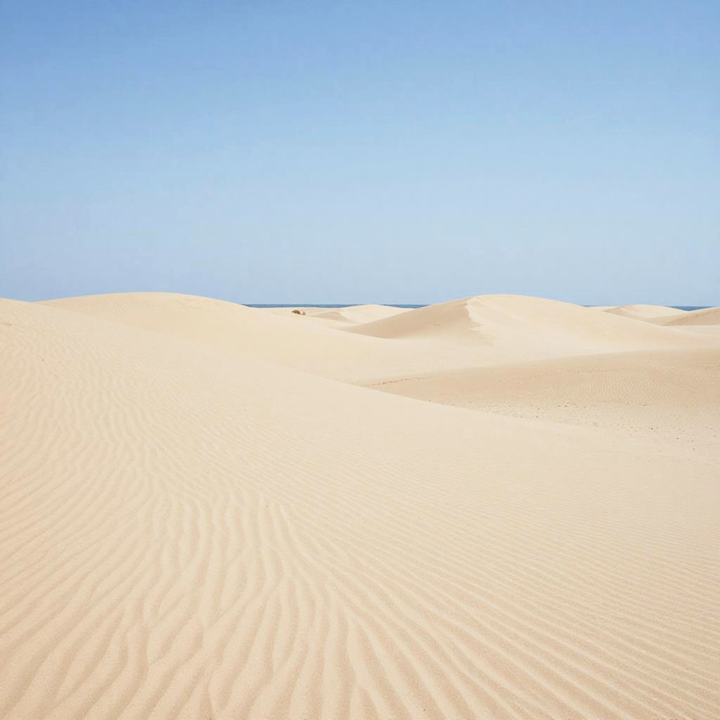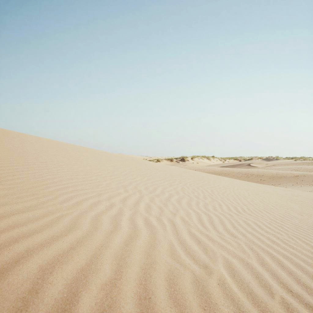 Sandy Peninsula, freshly wind-blown sand patterns, sunlit mid-morning haze, late afternoon, minimalist – gentle blurred shapes