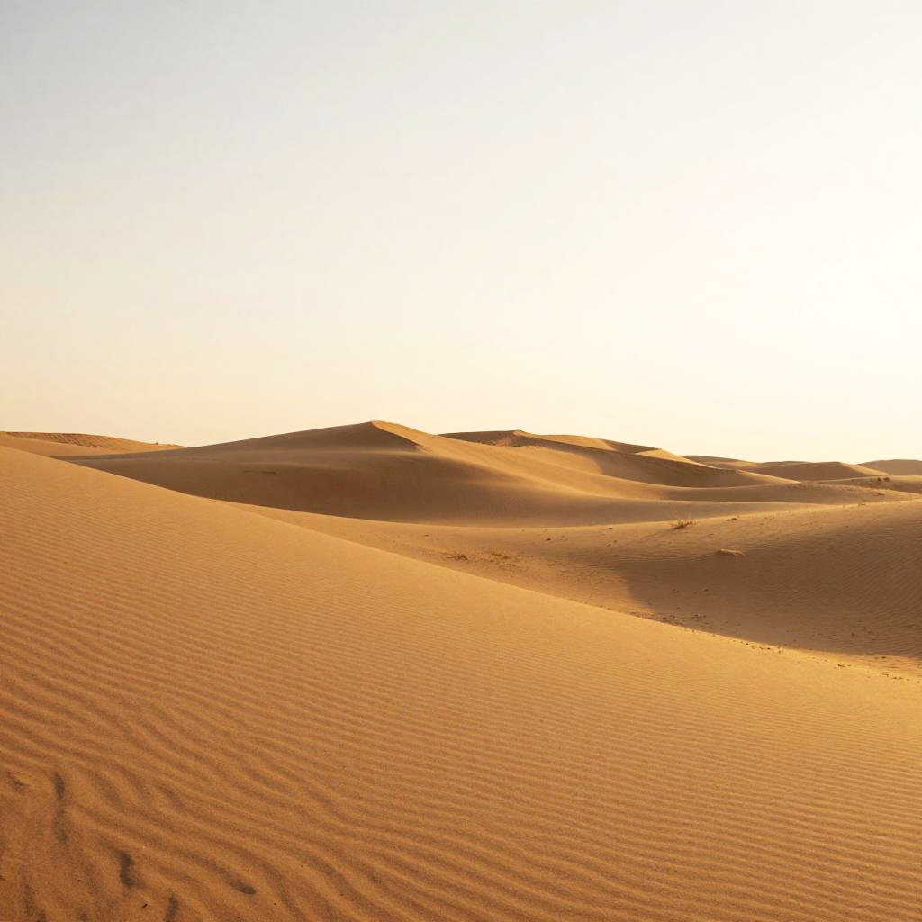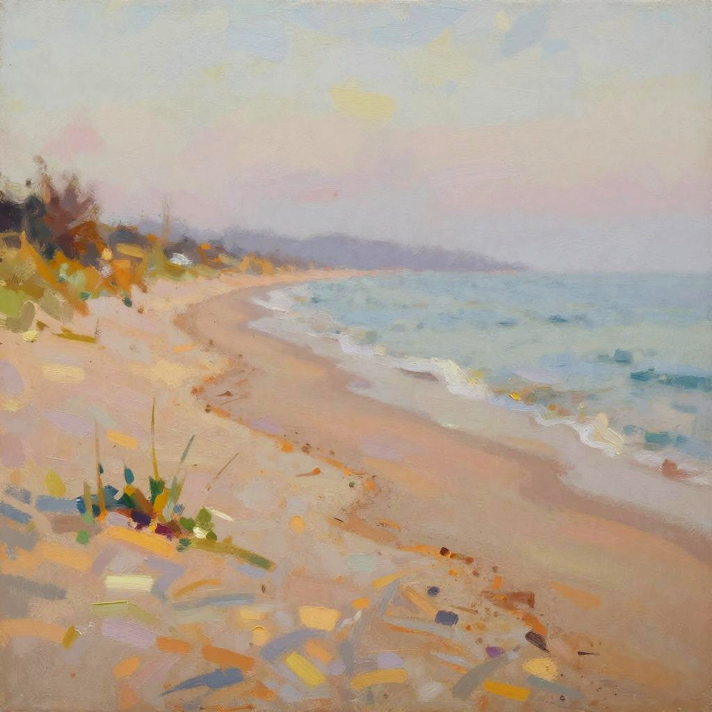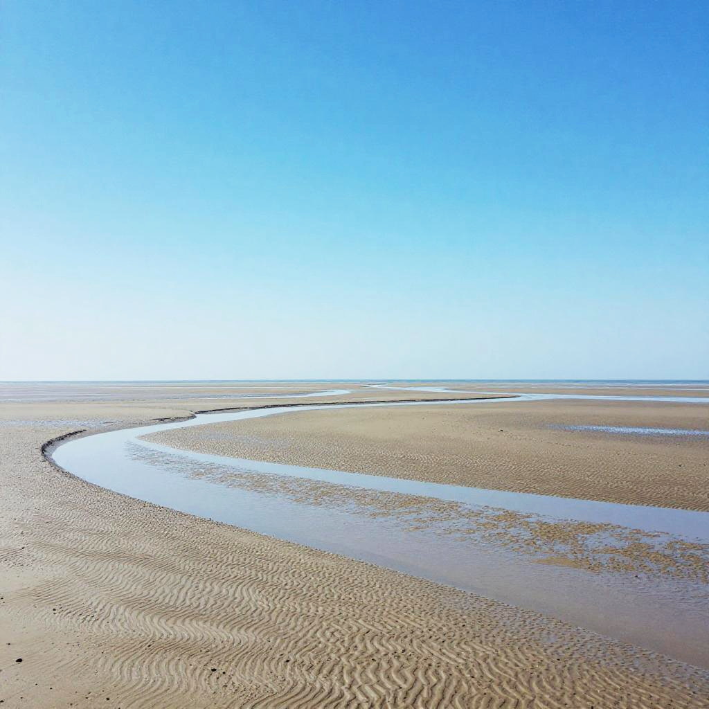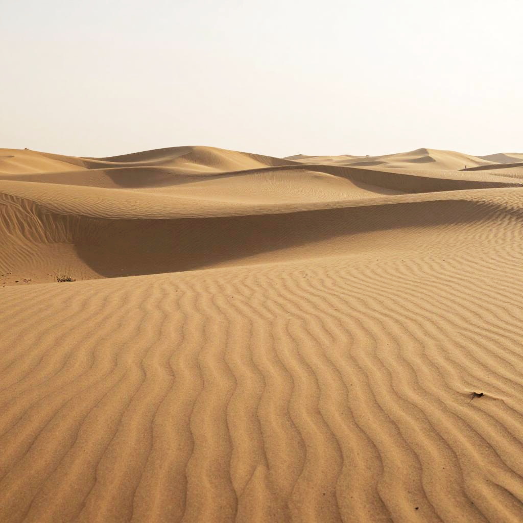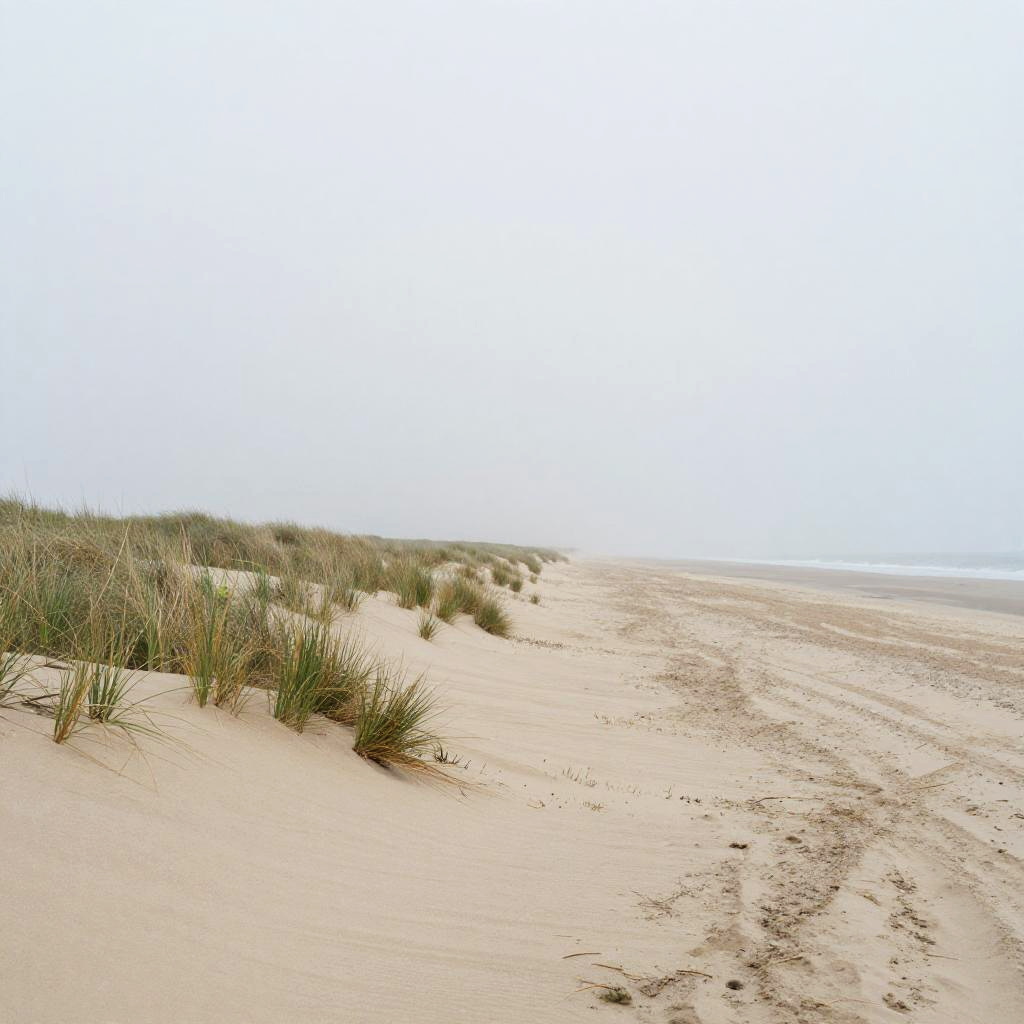 Sandy Peninsula, freshly wind-blown sand patterns, sunlit mid-morning haze, late afternoon, minimalist – gentle blurred shapes