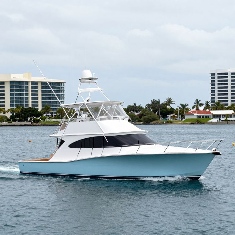 Powerful 2015 Viking 70 Sport Fish PIPE DREAMER cruising gracefully through calm waters, its sleek light-blue hull cutting through gentle waves as it moves past a backdrop of modern buildings and palm trees under a partly cloudy sky.
