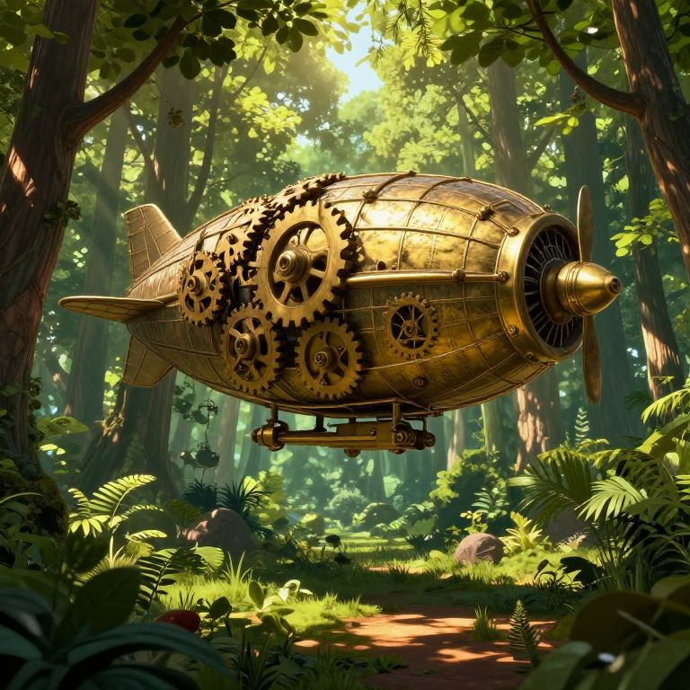 A vivid digital artwork showcases an airship with intricate gears and propellers flying above a verdant forest. The harmonious blend of brass machinery and lush foliage casts intriguing shadows on the ground, as golden sunlight pierces through the leaves, creating an atmosphere of adventure and mystery. This steampunk-inspired scene captures the essence of nature and technology coexisting in a breathtaking fusion.