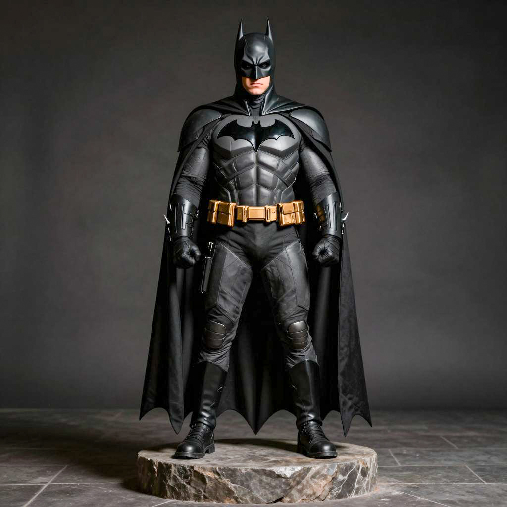 Superman statue with muscular physique, dark blue costume with red trunks and boots, red cape, and red Superman on chest. Standing on a base with crystal shards, right foot forward, fists clenched, black background. Dark hair, intense expression. Detailed ures on costume, realistic sculpture style. Number of people: 1.