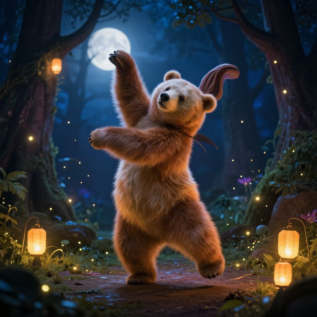 Damcingbear in a mystical forest clearing under glowing lanterns, performing an elegant dance with flowing movements, soft moonlight illuminating its fur, surrounded by fluttering fireflies and enchanting nature, vivid colors with a magical atmosphere.