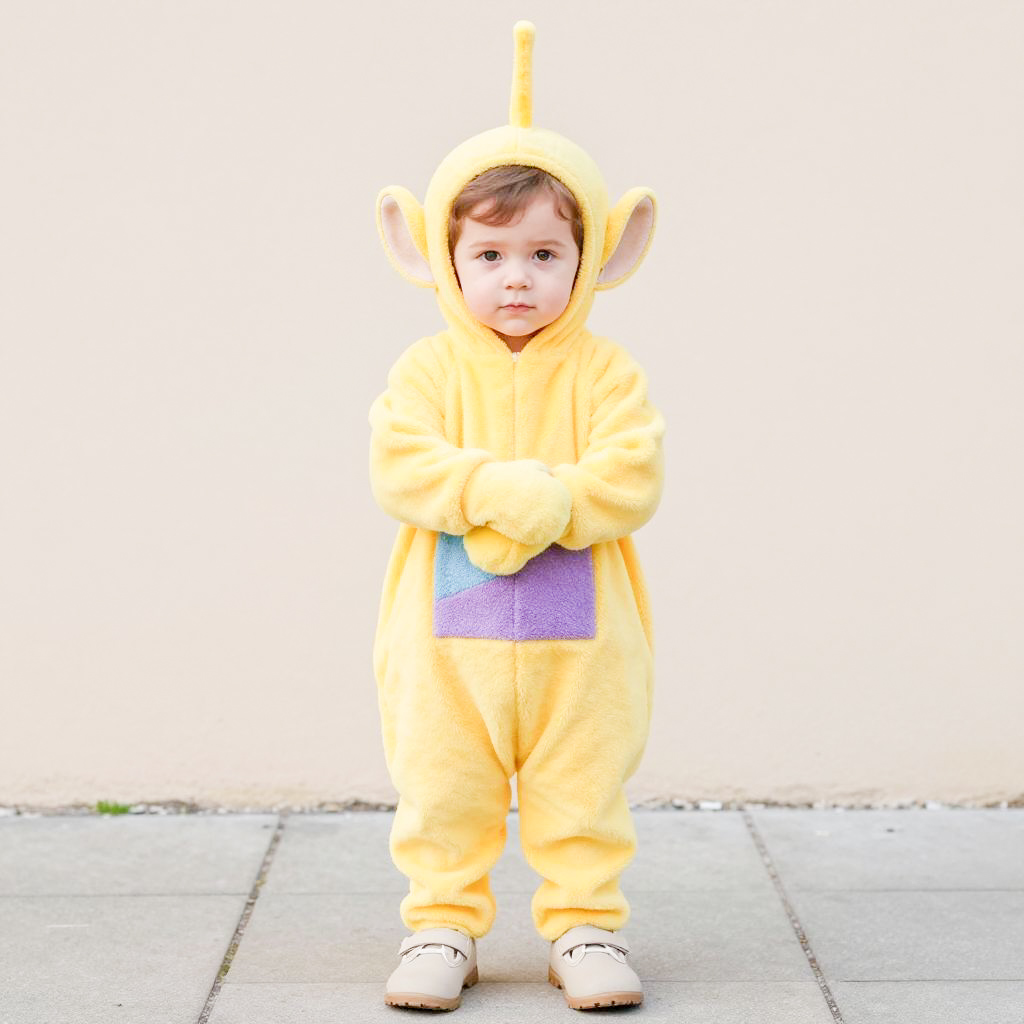 Kid snowsuit costume, photograph of a young child standing in the middle of a snowy street, wearing a yellow winter onesie with a hood, green gloves, and black shoes, slight blur in the background, people and bare trees in the distance, overcast sky, child has short brown hair, neutral expression, daytime, winter clothing, urban setting, realistic style, casual outdoor scene