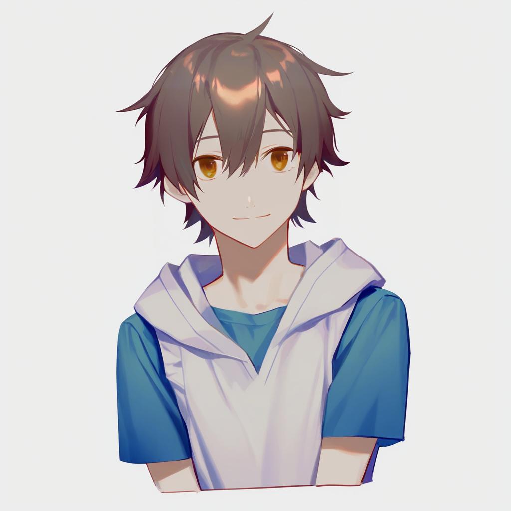 Digital illustration of an anime-style boy with short brown hair and brown eyes. The character is wearing a blue short-sleeve t-shirt layered with a white sleeveless hoodie with the hood down. The artwork features a clean, soft color palette and a calm expression.