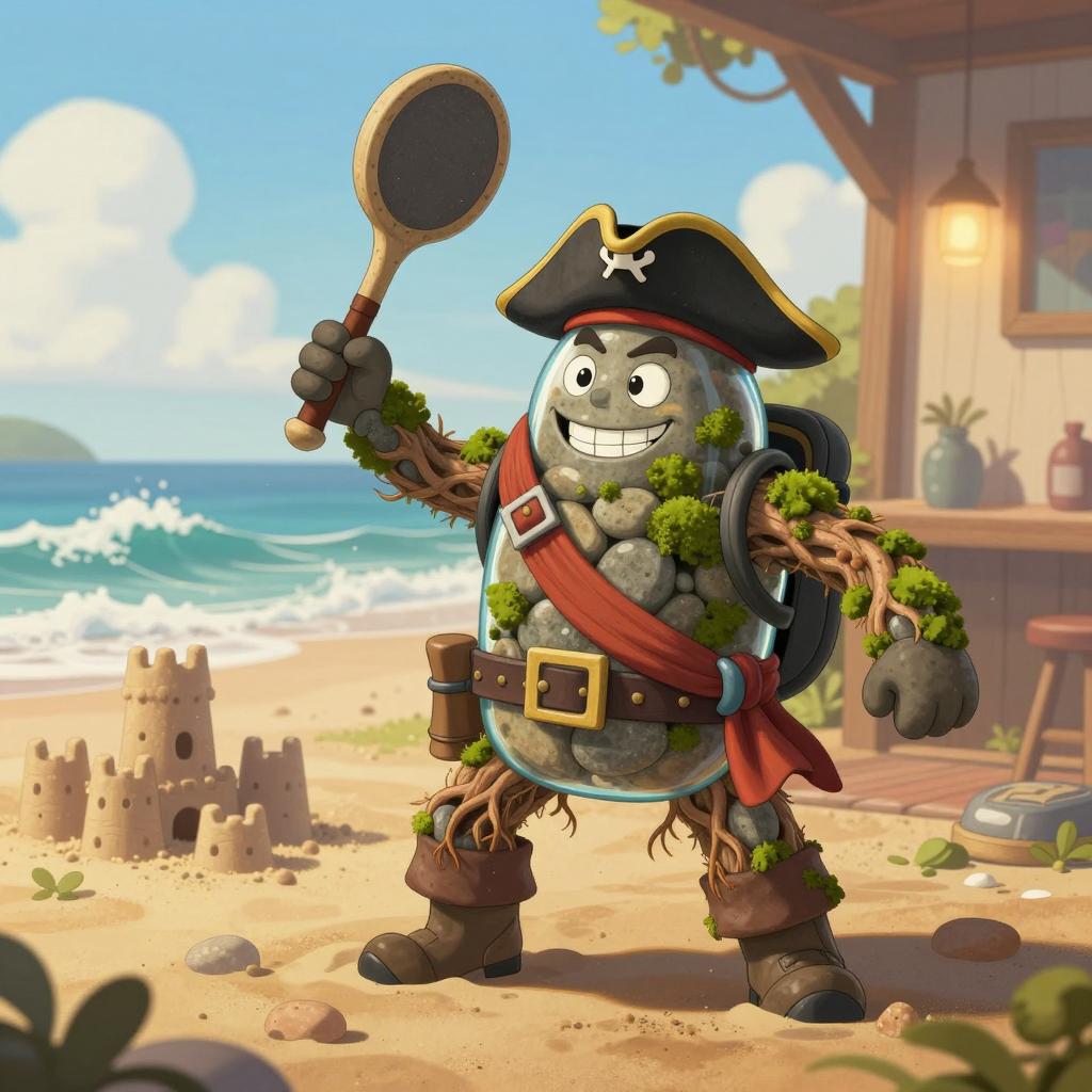 Anthropomorphic water bottle hiker character with moss-covered stones linked by roots body, pirate sash, belt, and tiny tricorn hat, mischievous smirk expression, mid-swing with a racket raised overhead in sunny beach with crashing waves and sandcastles, under warm indoor lamplight with cozy glow, children’s book illustration feel, highly detailed, dynamic composition, 8k render