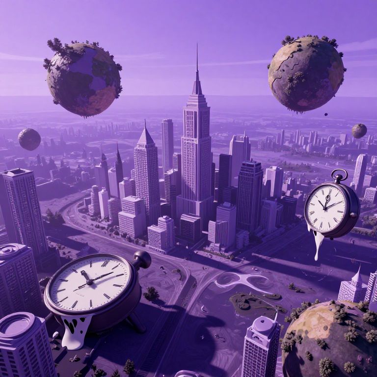 A captivating digital art composition reminiscent of surrealism, depicting an enigmatic dreamscape where conventional laws of physics seem to bend and break. From an aerial viewpoint, witness a whimsical cityscape adorned with melting timepieces and levitating landmasses suspended in a void. The scene is bathed in an otherworldly, lavender-hued light that stretches elongated shadows across the surreal landscape, creating an atmosphere at once unsettling and intriguing. This enthralling image masterfully intertwines the familiar with the fantastical, inviting viewers to immerse themselves in its enigmatic allure and delve into the mysteries of their own imagination.