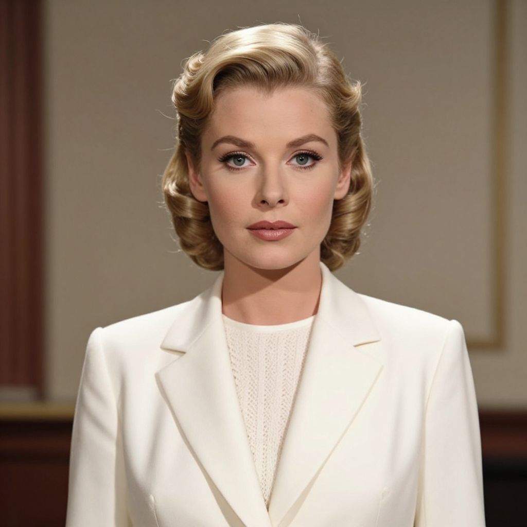 A high-definition 3D-rendered portrait captures the timeless elegance of a woman with classic, dapper styling reminiscent of Grace Kelly, featuring meticulously coiffed blonde hair, subtle makeup, and a chic white blazer over a textured blouse, all set against a softly lit, vintage-inspired backdrop.